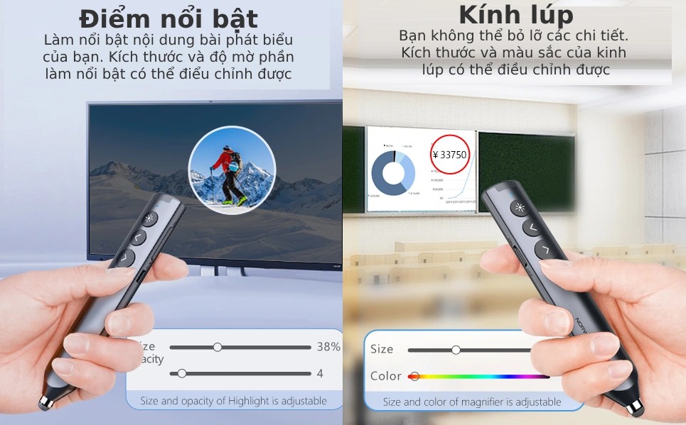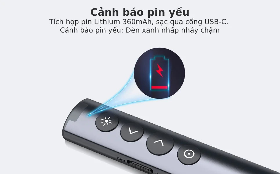 Laser xanh: Người dẫn chương trình không dây với tia laser màu xanh lá cây hiển thị tốt hơn trên nhiều nền khác nhau, ánh sáng xanh lục tươi sáng giúp bạn chỉ rõ mọi thứ