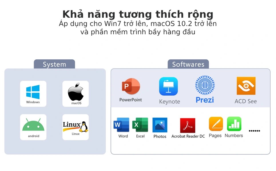 - Hệ điều hành hỗ trợ : Window, MacOS, Android Ứng dụng Bút trình chiếu Norwii N10S Pro phù hợp với nhiều loại thiết bị và môi trường làm việc khác nhau, từ phòng họp, lớp học đến các hội nghị lớn. Khả năng kết nối Bluetooth và RF giúp người dùng dễ dàng điều khiển từ xa với khoảng cách lên tới 50m, mang lại sự linh hoạt và tiện lợi trong quá trình thuyết trình. Đặc biệt, thiết kế tia laser màu xanh của sản phẩm làm nổi bật các chi tiết trên màn hình tương tác, bảng LED hay trong môi trường ánh sáng mạnh, giúp người nghe dễ dàng theo dõi và nắm bắt nội dung. Mua bút trình chiếu Ở Đâu ?