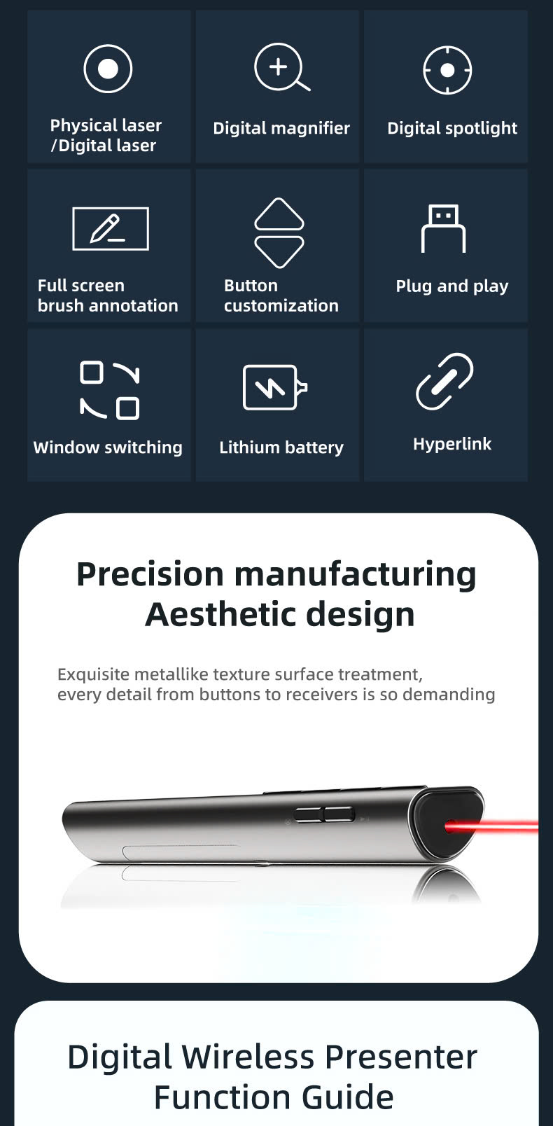 1. Tính năng: sử dụng trình chiếu, thuyết trình, word, PowerP 2. Led: màu đỏ 3. Sử dụng: Pin AAA 4. Khoảng cách chiếu Led: 100-200M 5. Khoảng cách điều khiển: sóng 2.4Ghz lên đến
