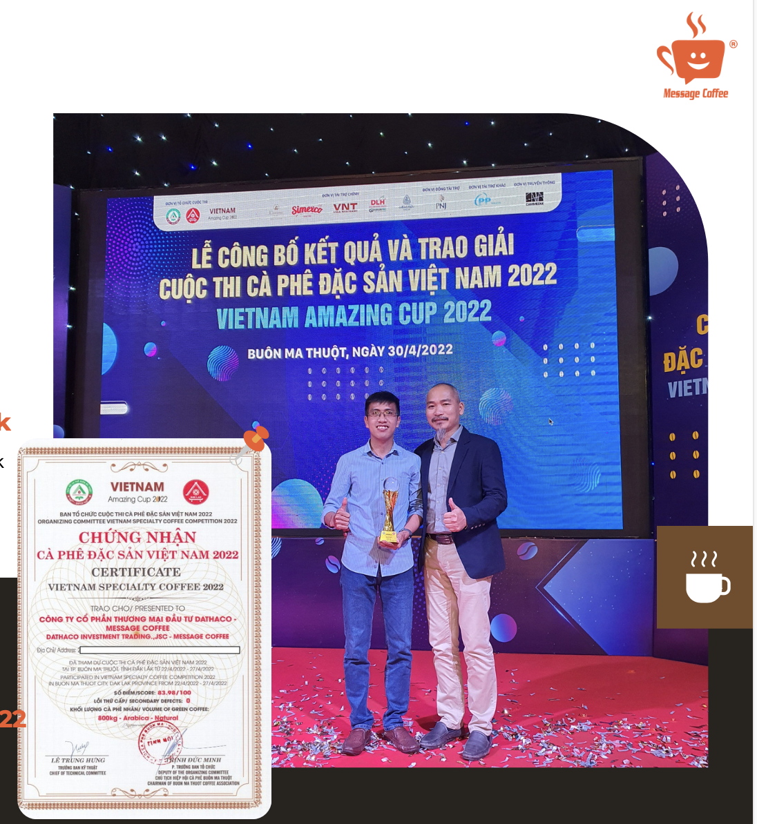 - 100% …TỪ TÂM của một người Nông dân sinh ra và lớn lên dưới gốc cây cả phê. Khát vọng lớn nhất của cuộc đời Mình là phổ biến cà phê sạch tới mọi người và giúp Bà Con những người nông dân trồng cà phê cải thiện đời sống một cách bền vững. Khi Bạn lựa chọn và tin dùng sản phẩm này…Bạn không chỉ giúp mình mà Bạn đang giúp những người Nông dân tại Tây Nguyên đó. VỀ MESSAGE COFFEE Chúng tôi đã và đang xây dựng Message Coffee là một trong những đơn vị cung cấp cà phê chất lượng cao phục vụ mục đích sử dụng cà phê sạch đến tất cả mọi người. Để giúp ổn định nguồn thu nhập cho các nông hộ, chúng tôi đã sẵn sàng đảm bảo đầu ra tốt bằng việc cải thiện khâu sơ chế, xây dựng giàn phơi, sử dụng công nghệ rang hiện đại để tăng tối đa chất lượng cà phê thành phẩm. Góp phần thay đổi thói quen sử dụng cà phê nguyên chất với kênh phân phối rộng khắp, hệ thống nhượng quyền. Bên cạnh đó còn là sợi dây kết nối bền vững giữa chúng tôi và nông dân trồng cà phê. Chúng tôi sử dụng quy trình khép kín từ nông trại đến ly cà phê (From Farm to Cup)