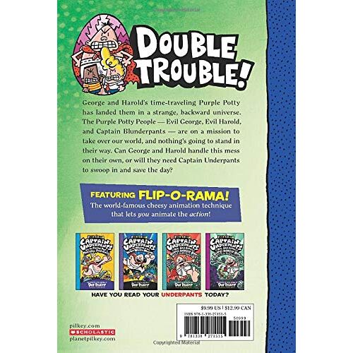 Captain Underpants #8: Captain Underpants And The Preposterous Plight Of The Purple Potty People (Color Edition) Now in full color! George and Harold's time-traveling Purple Potty has landed them in a crazy place! The teachers are nice, the cafeteria serves delicious food, and the school principal, Mr. Krupp, thinks they're hilarious. Something is very, very wrong -- and it gets even wronger when the boys' pet pterodactyl, Crackers, and Sulu the Bionic Hamster are captured by George and Harold's evil-twin look-alikes. Now George and Harold must face their greatest foes yet: THEMSELVES! Can they handle this mess on their own, or will they need Captain Underpants to swoop in and save the day?