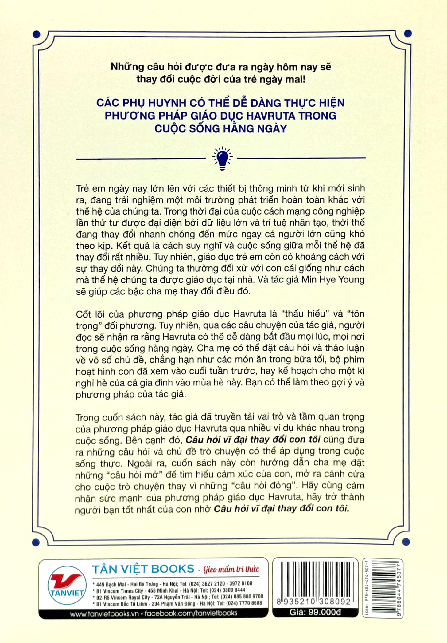 Trong cuốn sách này, tác giả đã truyền tải vai trò và tầm quan trọng của phương pháp giáo dục Havruta qua nhiều ví dụ khác nhau trong cuộc sống. Bên cạnh đó, Câu hỏi vĩ đại thay đổi con tôi – Havruta cũng đưa ra những câu hỏi và chủ đề trò chuyện có thể áp dụng trong cuộc sống thực. Ngoài ra, cuốn sách này còn hướng dẫn cha mẹ đặt những “câu hỏi mở” để tìm hiểu cảm xúc của con, mở ra cánh cửa cho cuộc trò chuyện thay vì những “câu hỏi đóng”. Những câu hỏi được đưa ra ngày hôm nay sẽ thay đổi cuộc đời của trẻ ngày mai. Cha mẹ hãy cùng cảm nhận sức mạnh của phương pháp giáo dục Havruta, hãy trở thành người bạn tốt nhất của con nhờ Câu hỏi vĩ đại thay đổi con tôi.