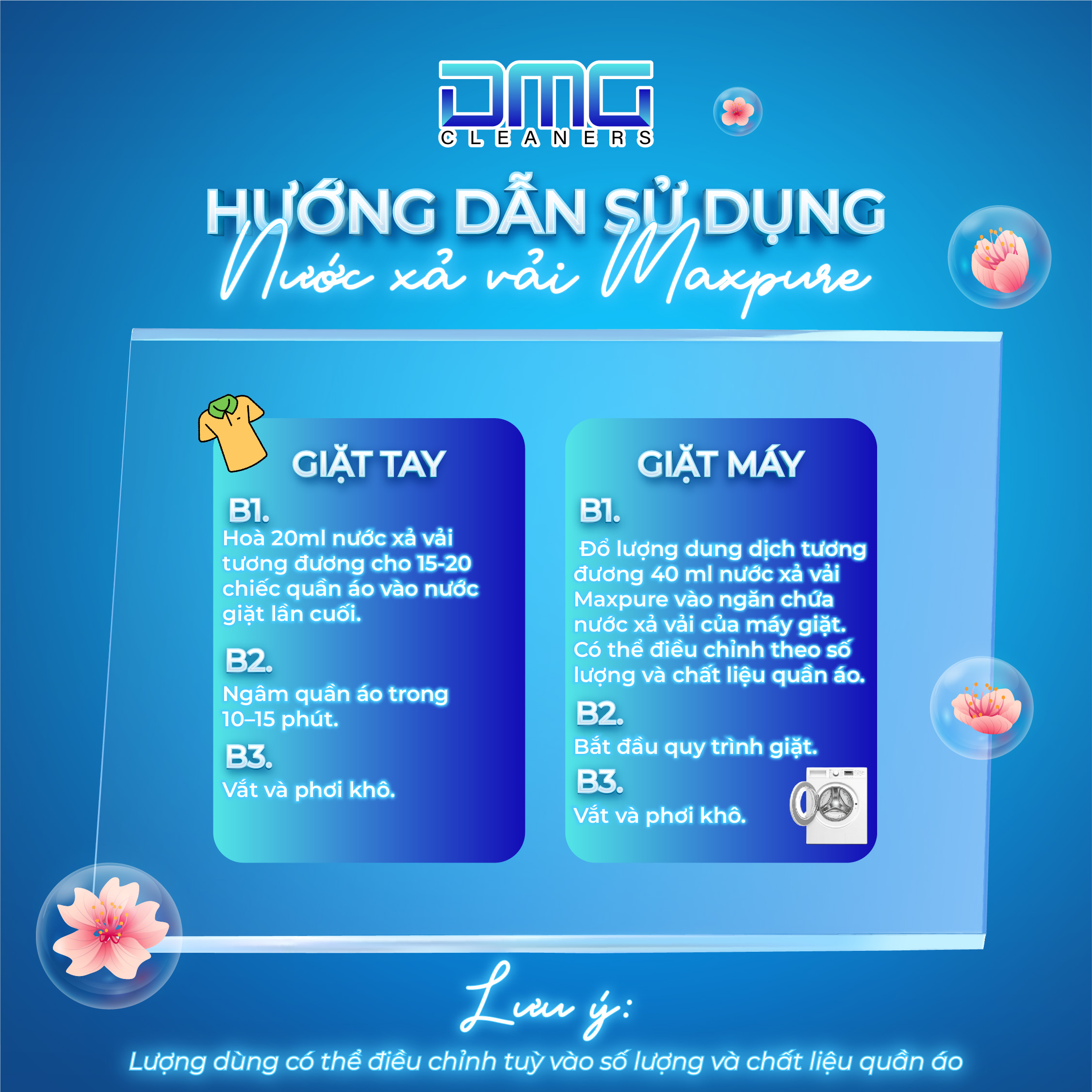 NƯỚC XẢ VẢI MAXPURE LƯU HƯƠNG SUỐT NHIỀU TUẦN KHÔNG PHAI MÙI Tạo lớp màng mềm mượt bao phủ sợi vải khiến cho quần áo mềm mại hơn sau khi giặt. Giúp cho sản phẩm