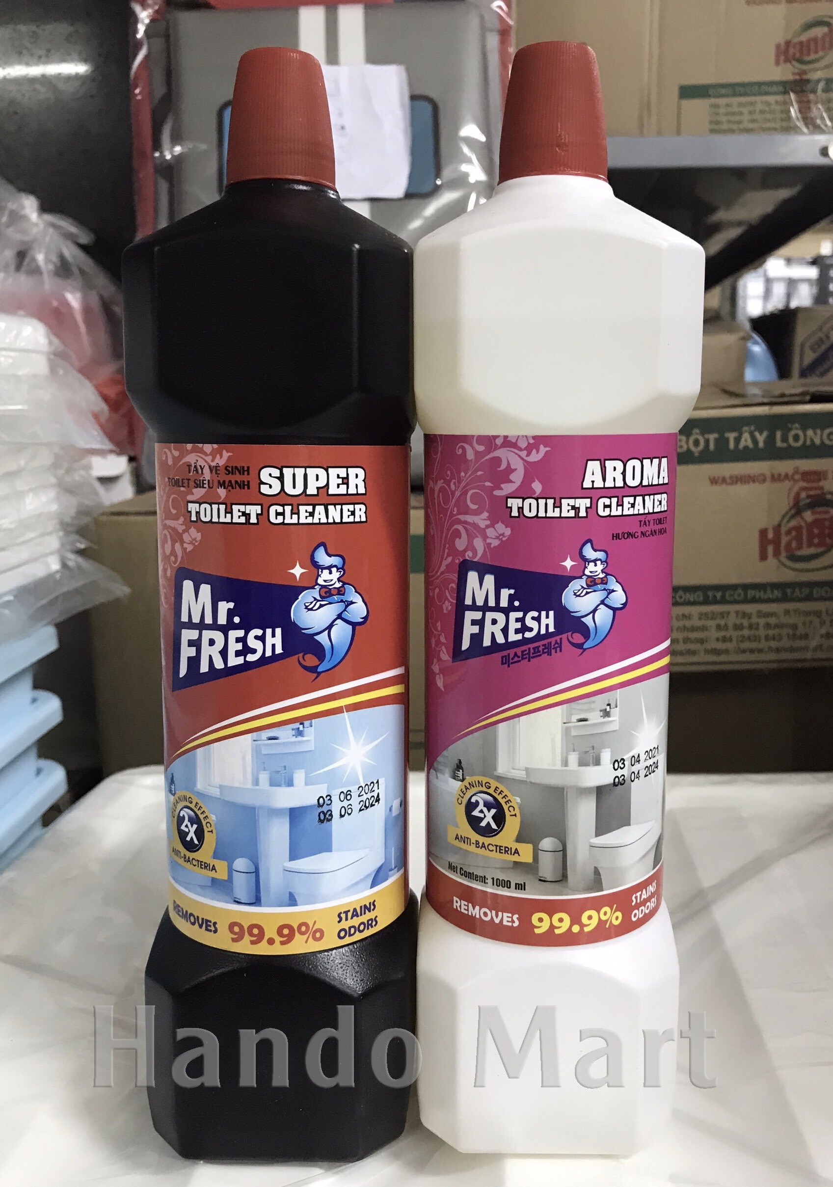 Tên sản phẩm: Chai Tẩy vệ sinh toilet Mr.Fresh 1L siêu mạnh Xuất xứ: Hàn Quốc Thương Hiệu: Mr fresh Thể tích: 1000 ml Phân loại: Tẩy siêu mạnh Tẩy sạch các vết bẩn bám vào thành toilet và diệt tận gốc vi khuẩn có hại. Sử dụng công nghệ mới đặc biệt tiết kiệm giúp tăng hiệu quả sử dụng đánh tan các vết bẩn lâu ngày két lại và hạn chế sự sinh trưởng của vi trùng gây hại. Khử mùi hôi nhanh đông thời mang đến hương hoa thơm mát dễ chịu, hoàn toàn loại bỏ mùi hóa chất khó chịu. Công dụng: