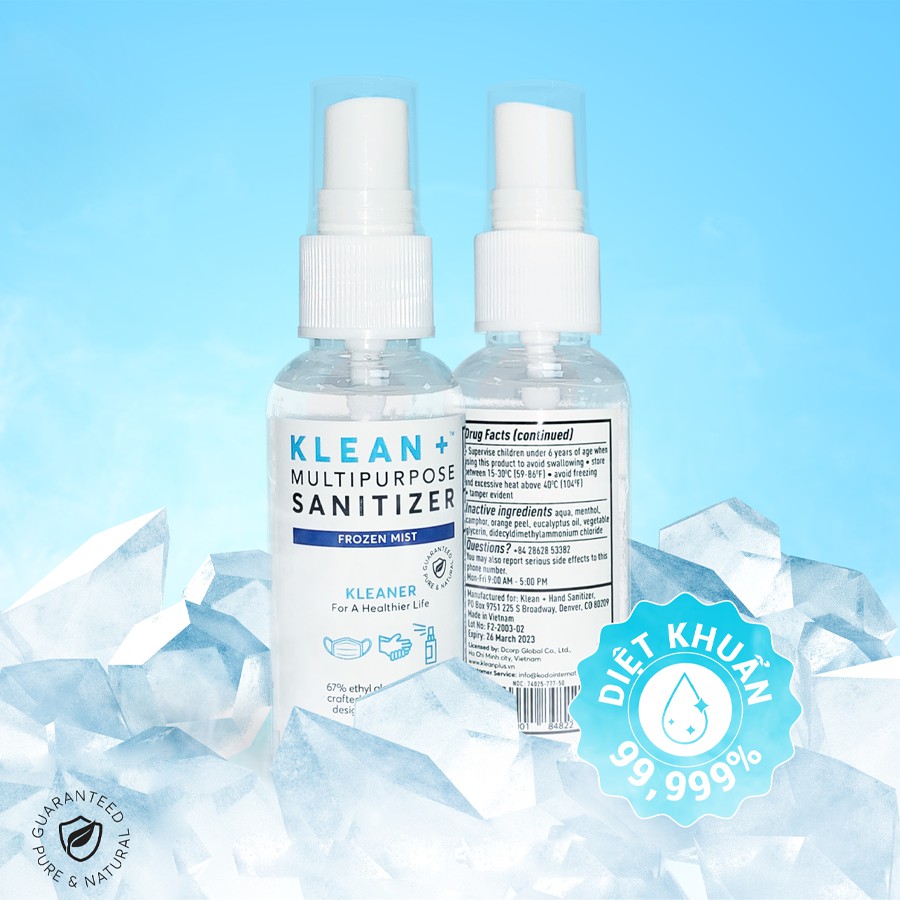 Dung dịch Klean+ dạng phun sương, chứa các loại tinh dầu thiên nhiên khử khuẩn làm sạch an toàn, giúp bạn: ️Tiêu diệt 99,99% vi trùng, vi khuẩn và nấm gây mùi khó chịu. ️Làm sạch an toàn cho đôi tay của bạn vì chứa 100% thành phần thiên nhiên, có chứng nhận FDA của Mỹ ️Làm sạch đa năng cho khẩu trang, mắt kính, mũ bảo hiểm, điện thoại di động, laptop, ️Sản phẩm có chứng nhận của TUV của Đức và Vinacontrol. ️Dung lượng 50ml, trên 350 lần xịt, nhỏ gọn, tiện lợi, dễ mang theo. ️Thành phần: Ethanol 67%; nước, các loại tinh dầu thiên nhiên có tính năng sát khuẩn cao, chiết xuất thực vật chống khô da ️Hương thơm tự nhiên rất dễ chịu, tạo cảm giác thư giãn, sạch sẽ cả ngày Có 03 mùi hương chính để lựa chọn gồm: ️Frozen mist: Tinh dầu tự nhiên: bạc hà, cây long não, vỏ cam, khuynh diệp. ️Forest mist: Tinh dầu tự nhiên: tràm trà, sả, bạc hà, chanh. ️Yuzu mist: Tinh dầu tự nhiên: chanh Yuzu, vỏ bưởi, gừng. HƯỚNG DẪN SỬ DỤNG Xịt trực tiếp vào tay hay các vật dụng muốn làm sạch ️Đợi khoảng 1 phút sau khi xịt cho khô tự nhiên ️Tránh tiếp xúc vào mắt. Không được phép uống. ️Không cho trẻ dưới 6 tuổi tự sử dụng ngoài tầm kiểm soát của người lớn.