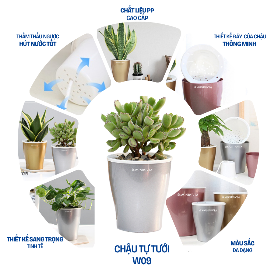 ✨Chậu tự tưới W09 Monrovia, chất liệu nhựa PP, thiết kế tráng bạc sang trọng, màu sắc tinh tế