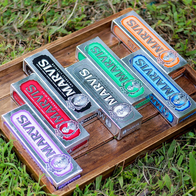 - Mùi hương: 7 màu với từng công dụng, mùi hương & thành phần khác nhau +, Trắng: Whitening Mint +, Tím: Jasmin Mint +, Xanh lá: Classic Stronger Mint +, Cam: Ginger Mint +, Đen: Amarelli Mint +, Xanh dương: Aquatic Mint +, Đỏ: Cinnamon Mint ================================ **** BẢN THƯỜNG THÔNG DỤNG - MARVIS 1/ Marvis Class Strong Mint ( màu ): hương bạc hà truyền thống, tác dụng làm sạch răng miệng, đem đến hơi thở mát mẻ, tươi mới 2/ Marvis Whitening Mint ( màu ️) : hương bạc hà và hoạt chất chuyên làm trắng răng 3/ Marvis Amarelli Mint ( màu ️): hương bạc hà, thêm chiết xuất cam thảo và than tre, phù hợp với những người thường xuyên h.ú.t t.h.u.ố.c, uống r.ư.ợ.u trà và cà phê - Làm Trắng mạnh mẽ 4/ Marvis Jasmin Mint (màu ): hương bạc hà kết hợp chiết xuất hoa nhài, đem lại hơi thở thơm tho, mát mẻ lãng mạn 5/ Marvis Ginger Mint (màu ): vẫn là hương bạc hà kết hợp với chiết xuất gừng tươi. Bảo vệ nứu lợi rất tốt 6/ Marvis Aquatic Mint (màu ): hương bạc hà cùng với vị dưa gang ngọt ngào say đắm 7/ Marvis Cinnamon Mint (màu ): hương bạc hà và quế cay cay nồng nồng, k.h.ử mùi sau khi ăn những thực phẩm có mùi nặng như m.ắ.m, ố.c, h.ải sản … CÔNG DỤNG