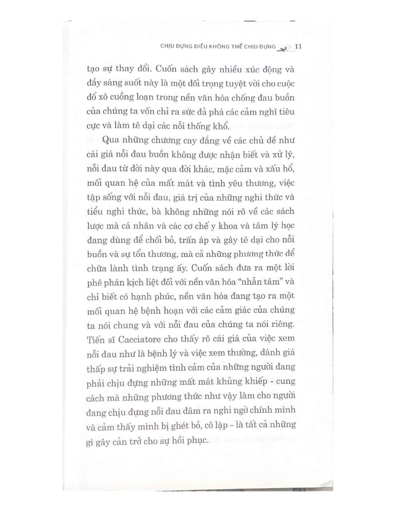 - Giới thiệu sách Chúng ta đang sống trong một thế giới đầy những bất an, mất mát, đau buồn. Và chúng ta cũng đang sống trong một nền văn hóa không ngừng tìm kiếm hạnh phúc. Những người đang buồn khổ luôn được khuyên: Hãy “nhìn vào khía cạnh tươi sáng”, hãy “suy nghĩ tích cực” hay hãy “biết ơn những điều may mắn”… Nhưng chính những lời nhạt nhẽo, trống rỗng này lại khiến cho các nạn nhân càng thêm mặc cảm và xấu hổ về chính những nỗi đau buồn của mình. Chịu đựng điều không thể chịu đựng truyền tải những câu chuyện chân thật, xúc động và kiến thức hữu ích, độc đáo về tất cả những cảm xúc mà con người phải trải nghiệm. Tác giả cũng chứng minh sức mạnh huyền bí của nỗi đau: khi biết kết hợp nỗi đau với lòng trắc ẩn, trái tim ta sẽ trở nên rộng mở, bao dung, nhân ái hơn và cuộc sống cũng sẽ có ý nghĩa hơn. Cuốn sách sẽ sưởi ấm cõi lòng và làm phong phú tâm hồn bạn, mời gọi bạn bước vào một cuộc sống cởi mở, can trường, biết quan tâm và chia sẻ.