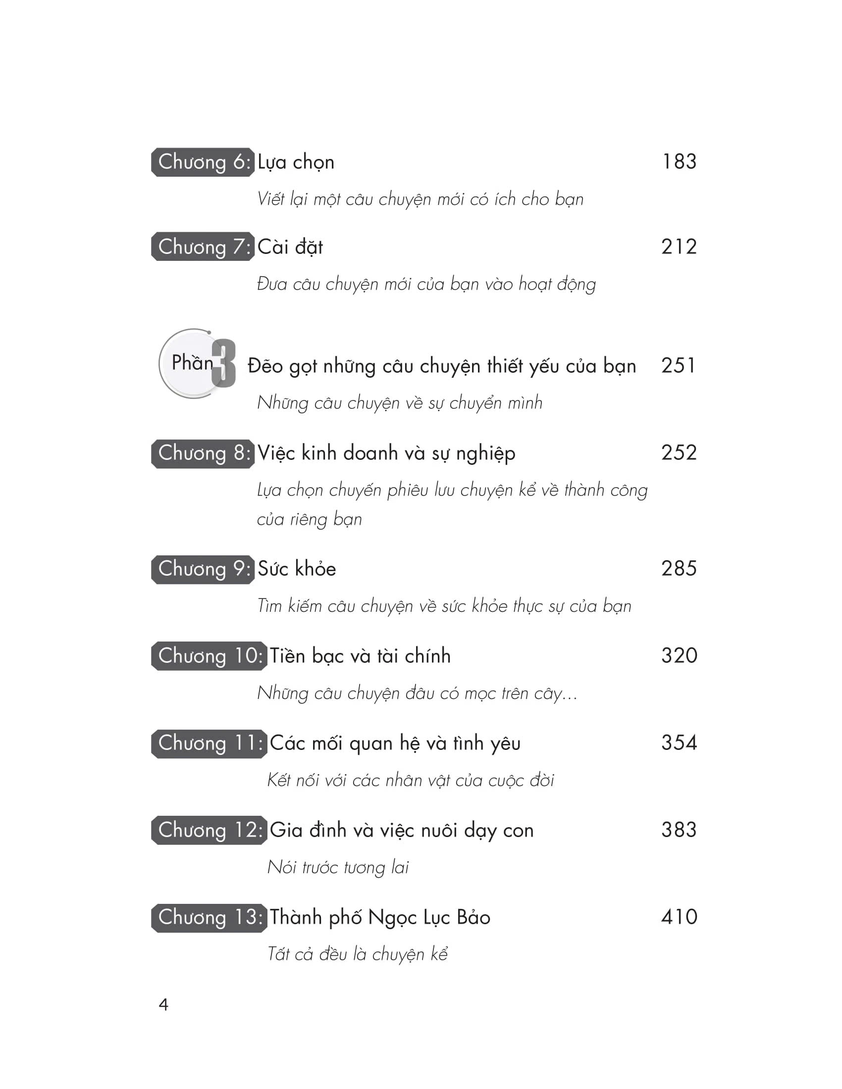 - Lựa chọn câu chuyện, thay đổi cuộc đời! Cuốn sáchnói về việc thay đổi câu chuyện cuộc đời bạn bằng cách thay đổi giọng nói trong đầu bạn, đưa ra phương pháp giúp bạn thay đổi từ bên trong nhằm thay đổi bên ngoài. Bên cạnh đó, cuốn sáchChọn Câu Chuyện Của Bạn, Thay Đổi Cuộc Đời Bạnbóc tách sự thật trong cách tạo ra cuộc sống mà bạn có, cùng những bước đi rõ ràng mà bạn có thể thực hiện để tạo ra cuộc sống bạn MUỐN. Những câu chuyện kể có sức mạnh vô cùng lớn lao, và sức mạnh đó nằm ngay bên trong bạn.Chỉ bằng cách lựa chọn kể cho mình những câu chuyện tốt đẹp hơn, chúng ta sẽ tạo ra những biến chuyển đáng kinh ngạc trong cuộc sống của mình. Giống như cô bé Dorothy đã tự mình xây dựng "con đường gạch vàng" nhờ sức mạnh bên trong mình, cuốn sách này bao gồm bộ công cụ bạn cần để viết lại câu chuyện đời mình,cũng như truyền cảm hứng để bạn hình dung lại cuộc đời theo cách bản thân chưa từng nghĩ đến, và để củng cố niềm tin cho bạn, cuộc sống là thứ có thể đạt được! Hãy cùng lựa chọn câu chuyện, thay đổi cuộc đời với cuốn sách Chọn Câu Chuyện Của Bạn, Thay Đổi Cuộc Đời bạn nhé!