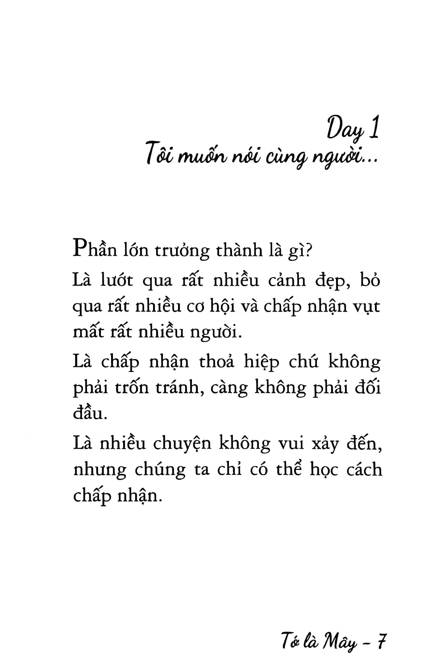Với phong cách viết văn nhẹ nhàng, mộc mạc, chân thành và giản dị, những bài viết của Mây mang đến nhiều góc nhìn mới về các vấn đề chung của tuổi trẻ như: ước mơ, tự do, những chuyến đi, lỗi lầm và cả biết bao khó khăn trên con đường trưởng thành, tìm lại bản thân mình. Người đọc sẽ tìm thấy được chính bản thể của mình trong câu chuyện về những người trẻ dám bước khỏi vùng an toàn của mình để phiêu lưu, để trưởng thành và tìm kiếm ước mơ.