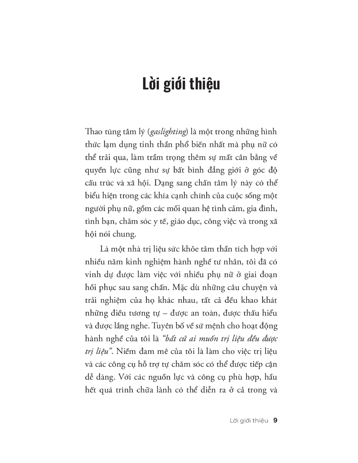 - Các dấu hiệu thao túng tâm lý cần nhận diện để phòng ngừa và phục hồi, trao cho phụ nữ khả năng tự ý thức về bản thân, hoàn toàn tin tưởng vào bản năng của mình khi cảm nhận được có điều gì đó không đúng. III. AI TÓM TẮT SÁCH Nhận diện “gaslighting”: Cuốn sách bắt đầu bằng việc giải thích khái niệm “gaslighting” và cách nhận biết các dấu hiệu của nó. Kelley nhấn mạnh rằng “gaslighting” là một dạng lạm dụng tâm lý, khiến nạn nhân nghi ngờ về thực tại và cảm xúc của chính mình. Các tình huống thực tế: Cuốn sách bao gồm các ví dụ thực tế về “gaslighting” trong nhiều khía cạnh của cuộc sống như gia đình, quan hệ tình cảm, công việc, học thuật và y tế. Điều này giúp người đọc hiểu rõ hơn về cách “gaslighting” có thể diễn ra và ảnh hưởng đến họ. Chương trình phục hồi: Kelley giới thiệu một chương trình phục hồi ba phần, bao gồm: hiểu về “gaslighting”, chữa lành sang chấn và khôi phục thực tại. Mỗi phần đều có các bài tập và kỹ thuật trị liệu giúp người đọc phát triển sự tự tin và khả năng tự bảo vệ. Phương pháp trị liệu: Cuốn sách cung cấp các phương pháp trị liệu dựa trên liệu pháp hành vi biện chứng (DBT), chánh niệm (mindfulness), và tự yêu bản thân (self-love) để hỗ trợ quá trình chữa lành và phục hồi của phụ nữ. Tự bảo vệ: Kelley cũng cung cấp các dấu hiệu của sự thao túng tâm lý và các chiến lược để phòng ngừa “gaslighting” trong tương lai. Cuốn sách này là một tài liệu quan trọng giúp phụ nữ lấy lại quyền kiểm soát cuộc sống của mình và xây dựng lại sự tự tin sau khi trải qua lạm dụng tâm lý. IV. CUỐN SÁCH CÓ GÌ ĐẶC BIỆT