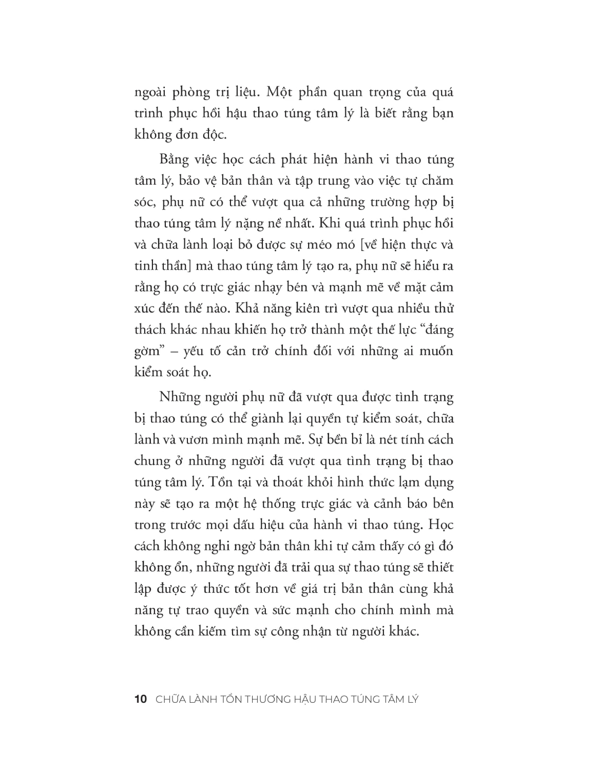 - Những người chắc chắn mình đang rơi vào bẫy thao túng của ai đó nhưng không biết cách thoát ra. … II. TÓM TẮT SÁCH Đây là một bộ cẩm nang đầy đủ, toàn diện giúp phụ nữ phục hồi sau khi bị thao túng tâm lý, lấy lại sự kiểm soát và tái lập cuộc sống. “Gaslighting” – thao túng tâm lý – là một trong số các hình thức lạm dụng cảm xúc mang tính tàn phá cao nhất đối với phụ nữ, khiến họ trở nên bất an, không tin vào thực tại cũng như nhận thức của chính mình, thậm chí gây cho họ ảo tưởng rằng họ mắc chứng tâm thần. Trong cuốn sách Chữa lành tổn thương hậu thao túng tâm lý, Tiến sĩ Amelia Kelley, nhà trị liệu tích hợp am hiểu về vấn đề sang chấn, đã đưa ra liệu pháp và các công cụ dựa trên bằng chứng xác thực để giúp đỡ phụ nữ phát hiện và tự bảo vệ mình trước sự thao túng vốn có khả năng diễn ra trong mọi khía cạnh đời sống, từ gia đình, các mối quan hệ tình cảm, đến công việc, học tập và y tế. Cách tiếp cận có hướng dẫn của bà nhằm chữa lành cho những người vừa thoát khỏi tình trạng bị lạm dụng sẽ giúp họ hình thành ý thức cao hơn về giá trị bản thân, lòng tự trọng và sức mạnh bên trong. Cuốn sách này bao gồm các nội dung chính sau:
