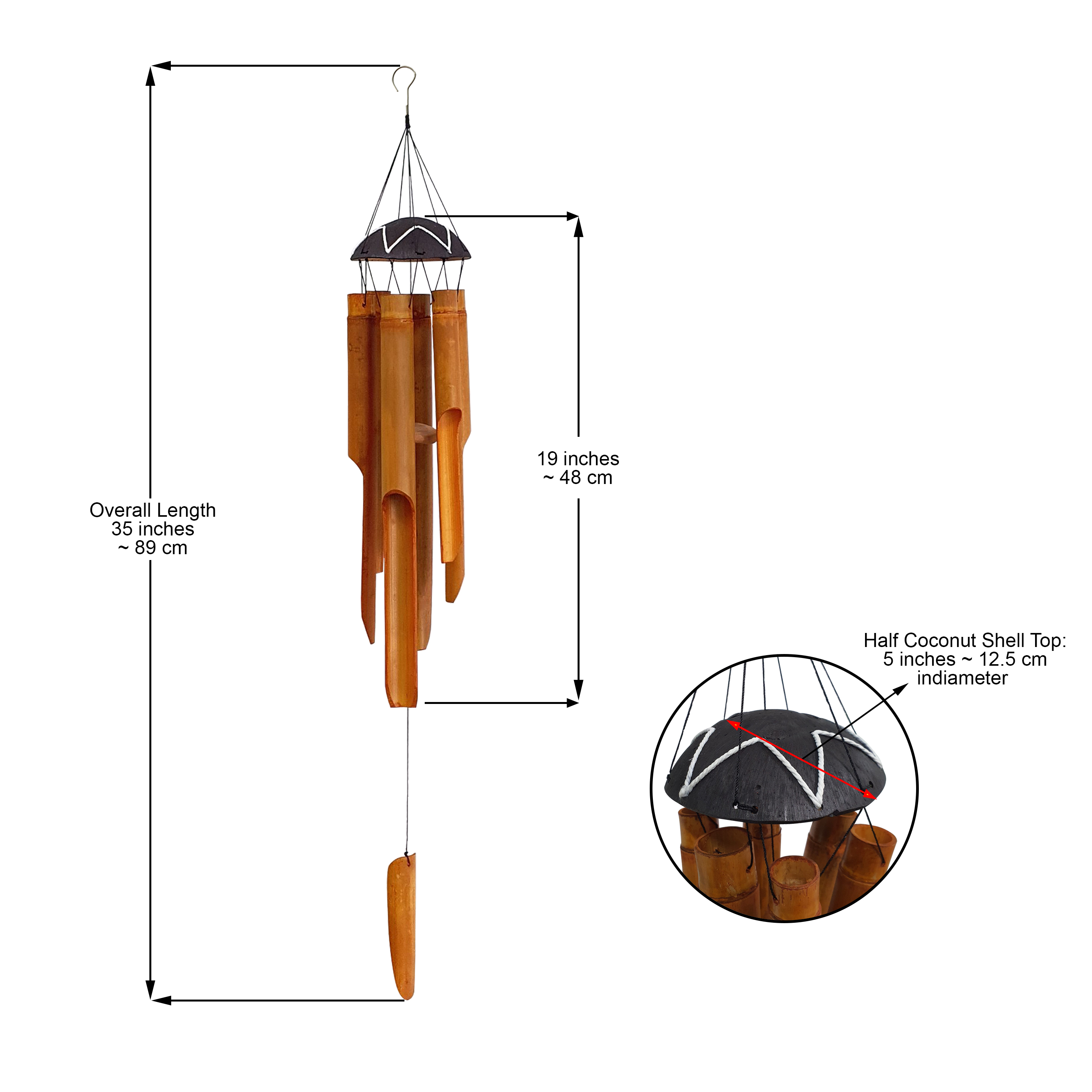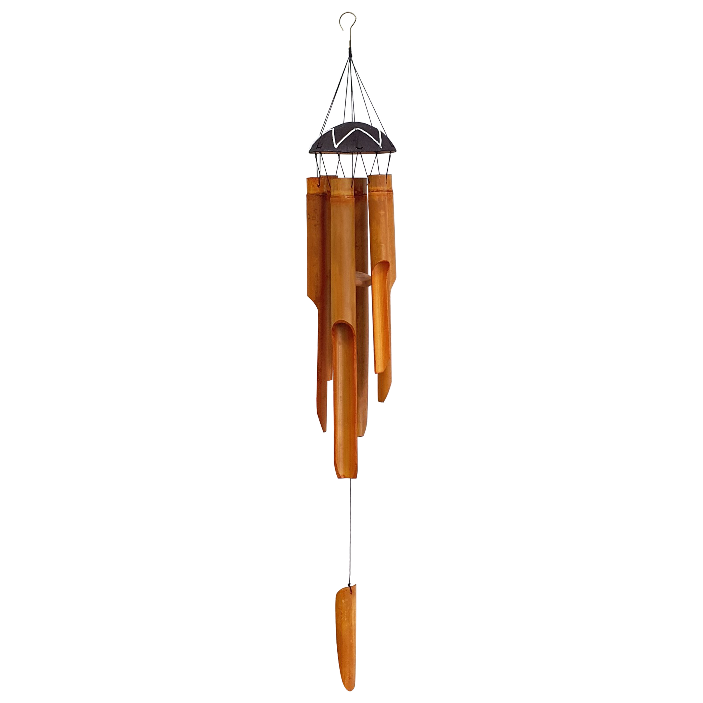 Chuông gió được làm bằng các ống tre với kích thước khác nhau và dưới bàn tay của nghệ nhân nó được biến tấu với các âm điệu khác nhau.Một bộ chuông gió gồm 6 ống tre, chóp bằng gáo dừa được trang trí hoạ tiết hình ngôi sao bắt mắt.