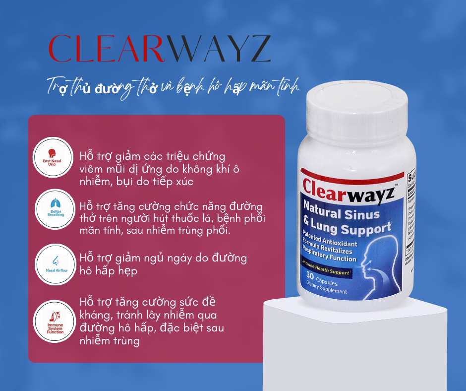 MỤC ĐÍCH SỬ DỤNG: Dị ứng thời tiết, phấn hoa… thường dẫn đến hắt hơi, khó thở. Các bệnh mãn tính như COPD, hen suyễn, tim mạch… thường gây khó thở, nhất là vào ban đêm. Người bị béo phì, đường thở hẹp... dẫn đến ngáy rất to khi ngủ, gây khó chịu cho người ngủ cùng, về lâu dài gây thiếu oxy máu dẫn đến nhiều bệnh lý mãn tính như bệnh tim mạch, giảm trí nhớ… Clearwayz giữ đường thở luôn thông thoáng, tăng miễn dịch hô hấp cho những đối tượng trên. Clearwayz giúp: