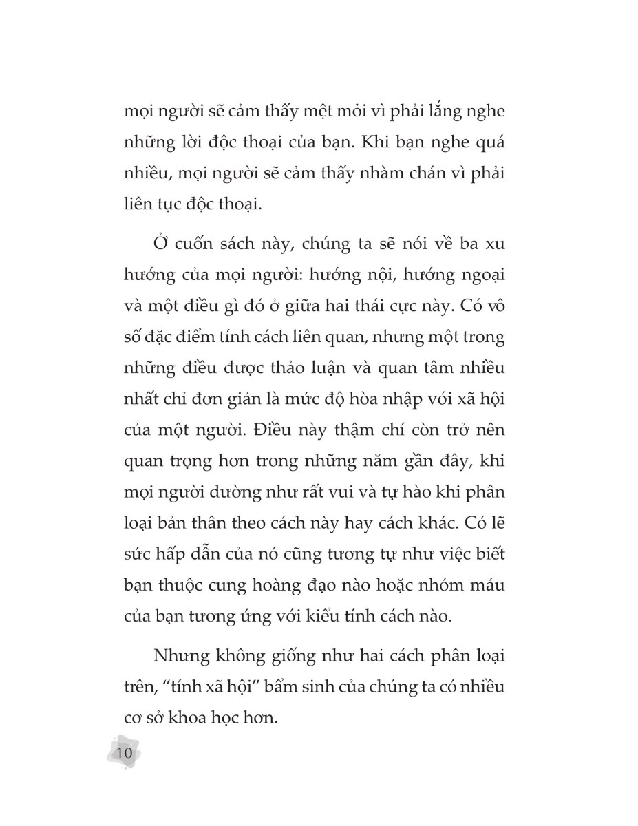 Hãy nhớ rằng, thang đo hướng nội - hướng ngoại truyền thống là một “sự phân đôi” sai lầm. Mọi người có thể nghiêng hơn về hướng này hay hướng khác, nhưng điều quan trọng là chúng ta vẫn đứng đâu đó ở giữa và có khả năng tận dụng những thế mạnh đến từ cả hai kiểu tính cách. Đó mới là lẽ thường.