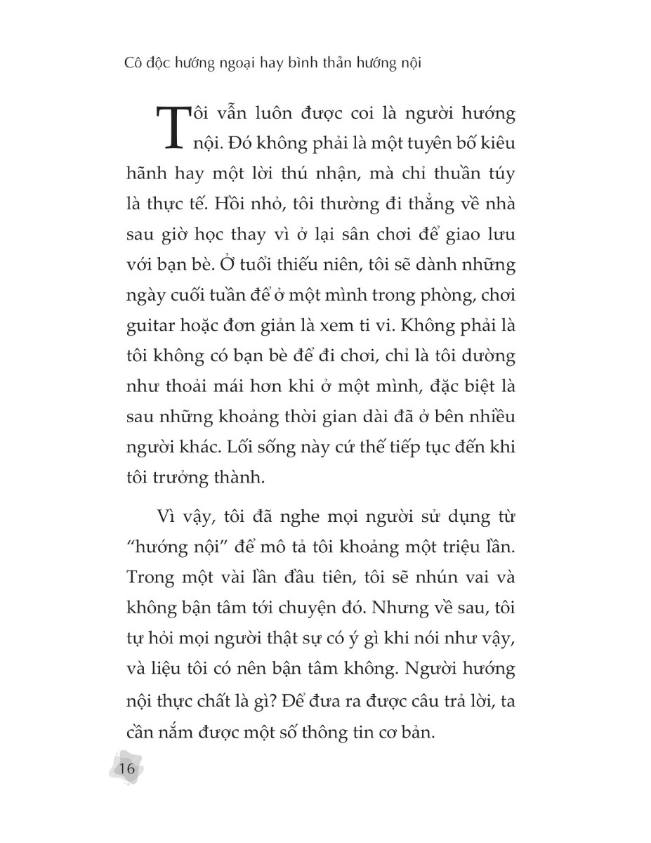 Dựa trên các nghiên cứu khoa học, cuốn sách “Cô độc hướng ngoại hay bình thản hướng nội” giải mã bản chất hướng nội, hướng ngoại một cách thực tế và dễ hiểu nhất, để ta hiểu hơn về chính mình và xóa bỏ những nhầm tưởng. Đây là một cuốn sách giàu tính thực chiến, đi sâu vào nguồn gốc của các kiểu tính cách, qua đó giải mã tâm lý và hành vi của con người trong những tình huống cụ thể. Chúng ta có thể tận dụng những kiến thức này để cuộc sống của mình thêm phong phú, cũng như thoải mái hơn với cá tính riêng của bản thân và đồng cảm với những người có phong cách sống khác biệt.