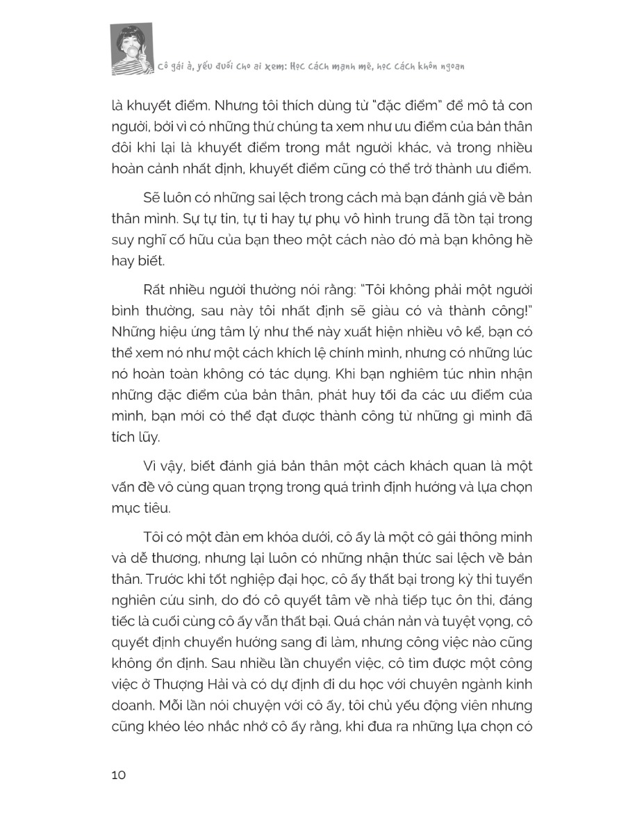 Cô Gái À, Yếu Đuối Cho Ai Xem - Học Cách Mạnh Mẽ, Học Cách Khôn Ngoan   “Cuộc đời này sẽ không vì bạn là con gái mà đối xử nhẹ nhàng.” Cô gái à, trên đời này có những thứ rất quan trọng mà chúng ta phải cần phải nắm bắt và trân trọng lấy – Đó chính là bản thân bạn. Cuộc sống của chúng ta chưa bao giờ là dễ dàng cả, lúc nào cũng luẩn quẩn với vòng xoay chuyện đời, chuyện người, chuyện tì chẳng ai có thể đoán trước điều gì sẽ xảy ra. Suy đi tính lại thì, đây cũng chỉ là mọi thử thách mà cuộc đời đặt ra cho mỗi người thôi. Trong cuốn sách “CÔ GÁI À, YẾU ĐUỐI CHO AI XEM” tác giả Tiểu Phi Ngư truyền tải nội dung thấm từng câu từng chữ dành tới các cô gái đang chất chứa đầy tâm trạng và nỗi buồn. Những gì tác giả viết đều là vấn đề mà phái nữ chúng ta thường gặp phải khiến cho người đọc cảm thấy như cuốn sách này viết ra để dành cho mình vậy. Những gì bạn nhận được khi đọc không chỉ là những bài học được đúc kết từ kinh nghiệm của tác giả giúp bạn có thể ứng biến trước cuộc đời, mà nó còn như là một liều thuốc tinh thần, một làn gió mới thổi mát tâm hồn mỏng manh, mang đến một tâm trạng tươi mới tới mọi cô gái! Khi bạn thấy lòng mình hỗn loạn đến mức bản thân không suy nghĩ được gì, hãy cứ ở một mình bởi đó sẽ là môi trường suy ngẫm tốt nhất. Ở trong những không gian trống vắng đó, bạn có thể gỡ bỏ lớp vỏ bọc bất lực, mệt mỏi trong cuộc sống. Bạn được tự do là chính mà không cần để tâm đến suy nghĩ và cảm nhận của ai cả, chỉ cần quan tâm đến cảm xúc của chính mình. Đây chính là sự giải thoát và tự do thật sự trong tâm hồn. Mỗi cô gái trong chúng ta, dù là trong độ tuổi học hành, hay độ tuổi lăn lộn với cuộc sống, dù đang dang dở trong tình yêu hay dần tiến tới vào hôn nhân thì cũng hãy luôn giữ cho mình một tinh thần thật tích cực. Bởi vì bạn có biết, cảnh giới cao nhất của cái đẹp chính là gì không? Đó chính là khi bạn khiến bản thân mình trở nên xinh đẹp không vì ai khác mà chỉ vì muốn bản thân mình vui vẻ, tự mình chìm đắm trong sự đẹp đẽ ấy. Tôi luôn hy vọng những cô gái đang theo dõi cuốn sách này có thể ít bị tổn thương nhất trong các mối quan hệ. Giữa sự ồn ào náo nhiệt của thế giới này, hãy cứ giữ cho mình một trái tim yên vui và điều làm nên sự thu hút nhất của người phụ nữ hiện đại chính là độc lập, tự chủ và có chính kiến riêng của mình.