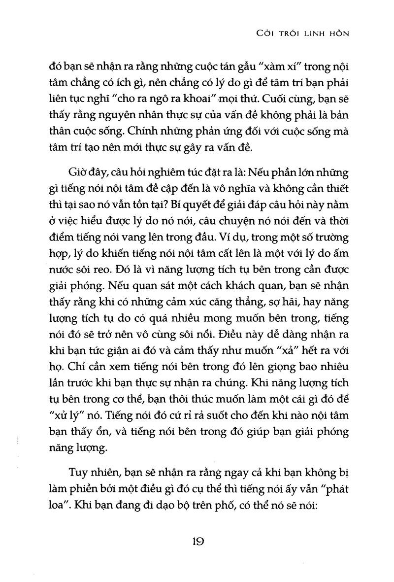 Cởi trói Linh hồn bắt đầu bằng cách dẫn dắt người đọc đi qua mối quan hệ giữa bản thân với những ý nghĩ và cảm xúc của chính mình, giúp độc giả khám phá nguồn gốc và những biến động của năng lượng bên trong. Sau đó, nó đào sâu vào những gì bạn có thể làm để giải phóng bản thân khỏi những ý nghĩ, cảm xúc và những hình thái năng lượng quen thuộc làm giới hạn tâm thức của bạn. Cuối cùng, với cách diễn giải đầy minh triết, cuốn sách này sẽ mở cánh cửa đến một cuộc đời mà ở đó con người sâu thẳm bên trong bạn được sống một cách tự do.