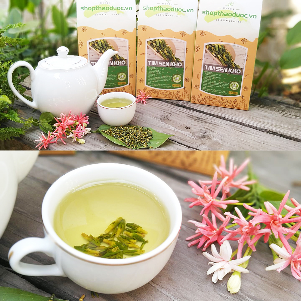 Thành phần: Tim sen tươi 100% sấy lạnh Công dụng: Trà tim sen (còn gọi là trà tâm sen) có vị đắng, tính hàn thường được sử dụng như một thảo dược trong y học