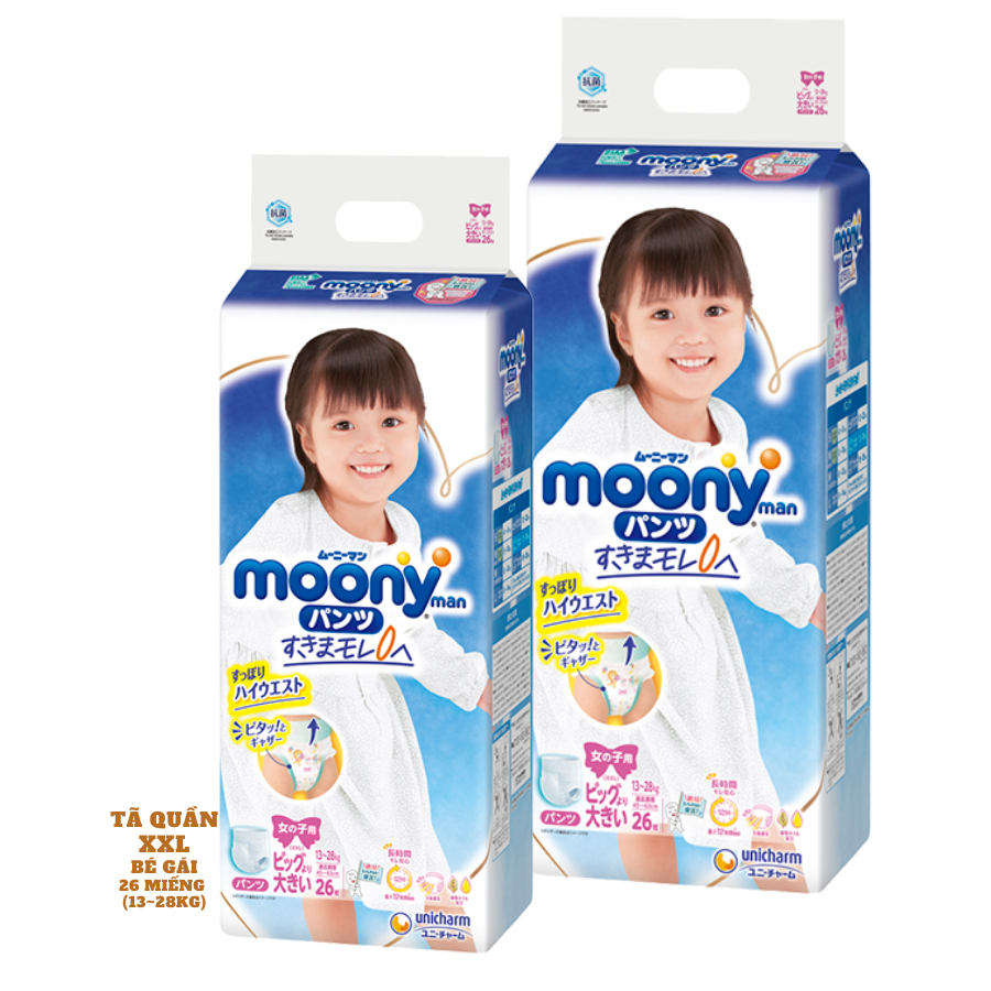 Giới thiệu Bỉm - Tã Quần Moony Blue (bé gái) size XXL 26 miếng (Cho bé 13-28kg) Nằm trong dòng sản phẩm tã Moony của thương hiệu Unicharm Nhật Bản, tã quần Moony man size XXL bé gái với thiết kế tã quần tiện lợi, chất liệu sợi Nano cao cấp, có lưng thun cải tiến - che phủ eo co giãn chống tràn, cùng khả năng thấm hút lên tới 12 tiếng, đặc biệt là chỉ thị ướt báo thời điểm thay tã không những sẽ mang đến cho bé gái yêu quý của bạn cảm giác thoải mái, dễ chịu tối đa mà còn tạo cho bố mẹ sự dễ dàng, thuận tiện trong công việc chăm sóc bé. Sản phẩm sẽ là lựa chọn hoàn hảo của bố mẹ dành tặng cho sức khỏe của con, giúp bé tự do hoạt động khám phá và phát triển. Đặc điểm nổi bật của sản phẩm  Chân thun đệm mây, co giãn linh hoạt - Tã quần Moony man size XXL  bé trai sở hữu thiết kế mới với lưng thun che phủ trên eo, giảm thiểu các khoảng hở giúp xua tan nguy cơ bị tràn tã, từ đó cho trẻ khô thoáng cả ngày.