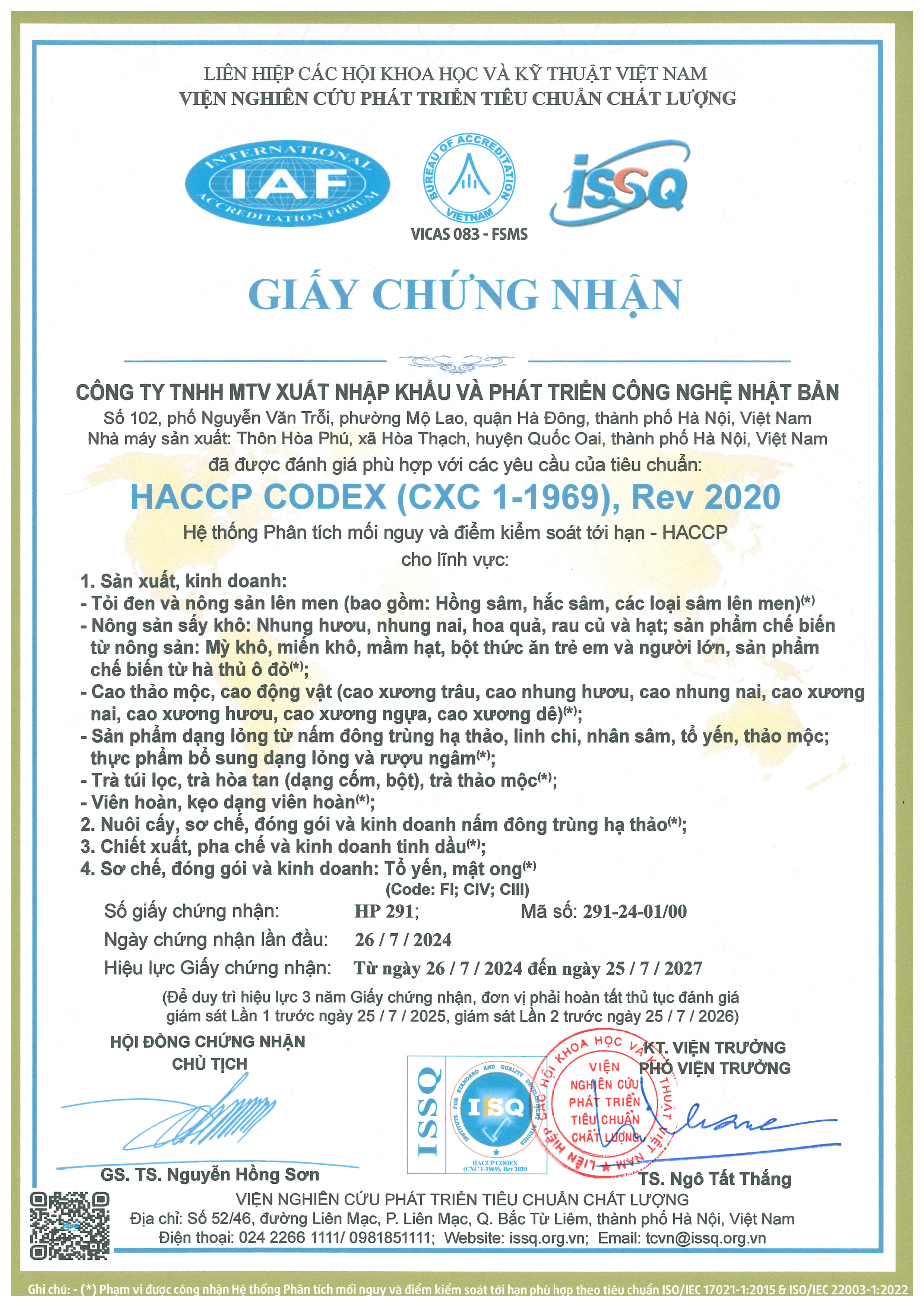 Quy trình nuôi cấy và chế biến đông trùng hạ thảo Kochi. Bước 1: Chuẩn bị hộp cơm thành phần gồm gạo nứt, nhộng tằm, đậu tương, vitamin, nước. Bước 2: Cấy giống. -Giống nấm đông trùng hạ thảo Kochi được cấy vào các hộp cơm trong tủ cấy để đảm bảo vô khuẩn. Bước 3: Nuôi tối tạo sợi -Nhiệt độ từ 20-25 độ C thời gian ủ tối từ 5-7 ngày Bước 4: Nuôi sáng tạo quả thể. -Những hộp cơm sau nuôi tối được chuyển sang phòng chiếu sáng 12h/1 ngày cường độ ánh sáng từ 500-1200 lux nhiệt độ từ 20-25 độ C độ ẩm từ 60-90%. Sau 7-10 ngày sợi nấm trắng chuyển dần sang vàng và mọc mầm nấm nhỏ. Sau khoảng 50 ngày sợi nấm màu vàng phát triển tối đa để thu hoạch. Bước 5: Thu hoạch bảo quản. Phần thể quả sấy khô đóng trong bao bì kín tránh ánh sáng. Đông trùng hạ thảo Kochi được nhiều chứng nhận uy tín như: Top 2 Hàng Việt Nam được người tiêu dùng yêu thích 2023. Chứng nhận FDA Hoa Kỳ. Chứng nhận an toàn thực phẩm ISO 22000 THÀNH PHẦN: Đông trùng hạ thảo HƯỚNG DẪN SỬ DỤNG:  Dùng ăn trực tiếp hoặc chế biến các món ăn tùy theo sở thích. Ngâm mật ong, ngâm rượu, hãm trà, hầm canh, chưng yến,… BẢO QUẢN: Nơi khô ráo, thoáng mát, tránh ánh sáng trực tiếp từ mặt trời. Đậy kín bao bì sau mỗi lần sử dụng.Lưu ý: Không dùng sản phẩm quá hạn hoặc có dấu hiệu bị hỏng. Lô SX (LSX), Ngày sản xuất (NSX), Hạn sử dụng (HSD): In trên bao bì. Sản xuất và chịu trách nhiệm bởi CÔNG TY TNHH MTV XUẤT NHẬP KHẨU VÀ PHÁT TRIỂN CÔNG NGHỆ NHẬT BẢN KOCHI (KOCHIGOLD) là thương hiệu Công ty TNHH MTV Xuất nhập khẩu và Phát Triển Công Nghệ Nhật Bản sứ mệnh trở thành biểu tượng niềm tin hàng đầu Việt Nam, vươn tầm quốc tế về các sản phẩm thực phẩm sử dụng hàng ngày mang lại lợi ích sức khỏe cho cộng đồng. KOCHI (KOCHIGOLD) cam kết cung cấp những sản phẩm sức khỏe đạt chuẩn quốc tế để mang lại những giá trị ý nghĩa thực sự cho cộng đồng và xã hội.