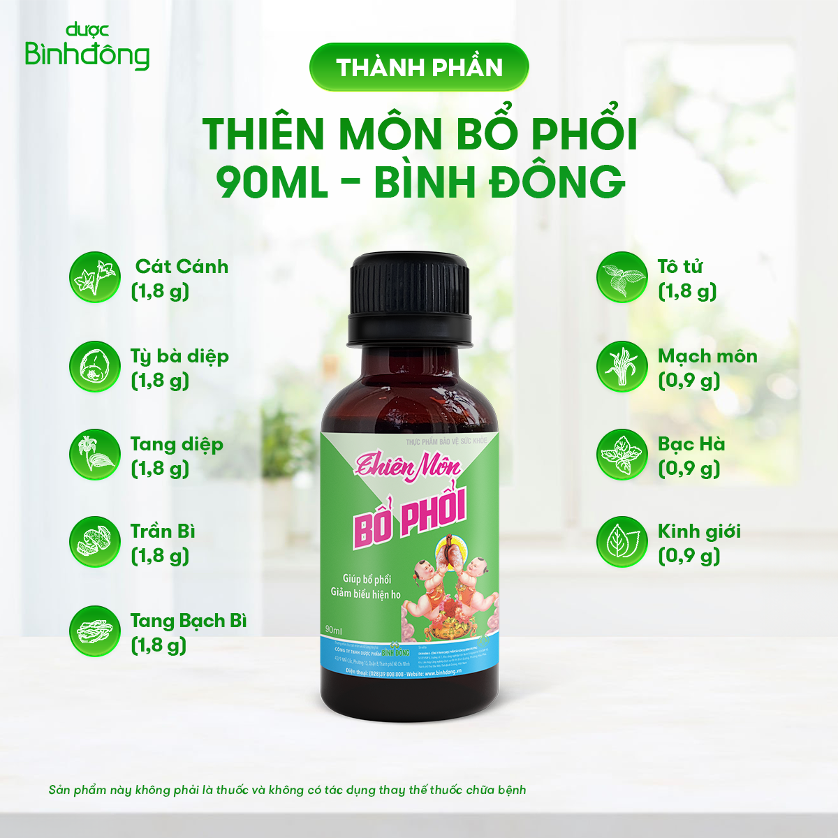 Thiên Môn Bổ Phổi của Dược Bình Đông – Chai 90ml dành cho Trẻ em - Bổ phổi, tăng cường sức đề kháng, giảm ho cho trẻ ✓ Trẻ nhỏ là đối tượng dễ bị tác động từ môi trường dễ sinh cảm ho, viêm họng, viêm phế quản. ✓ Vì vậy, Thiên Môn Bổ Phổi Trẻ Em chính là giải pháp giúp mẹ bảo vệ trẻ hữu hiệu. ✓ Thiên Môn Bổ Phổi Trẻ Em chiết xuất từ 100% thảo dược thiên nhiên, là thực phẩm bảo vệ sức khỏe mang lại tác dụng tốt trong việc: