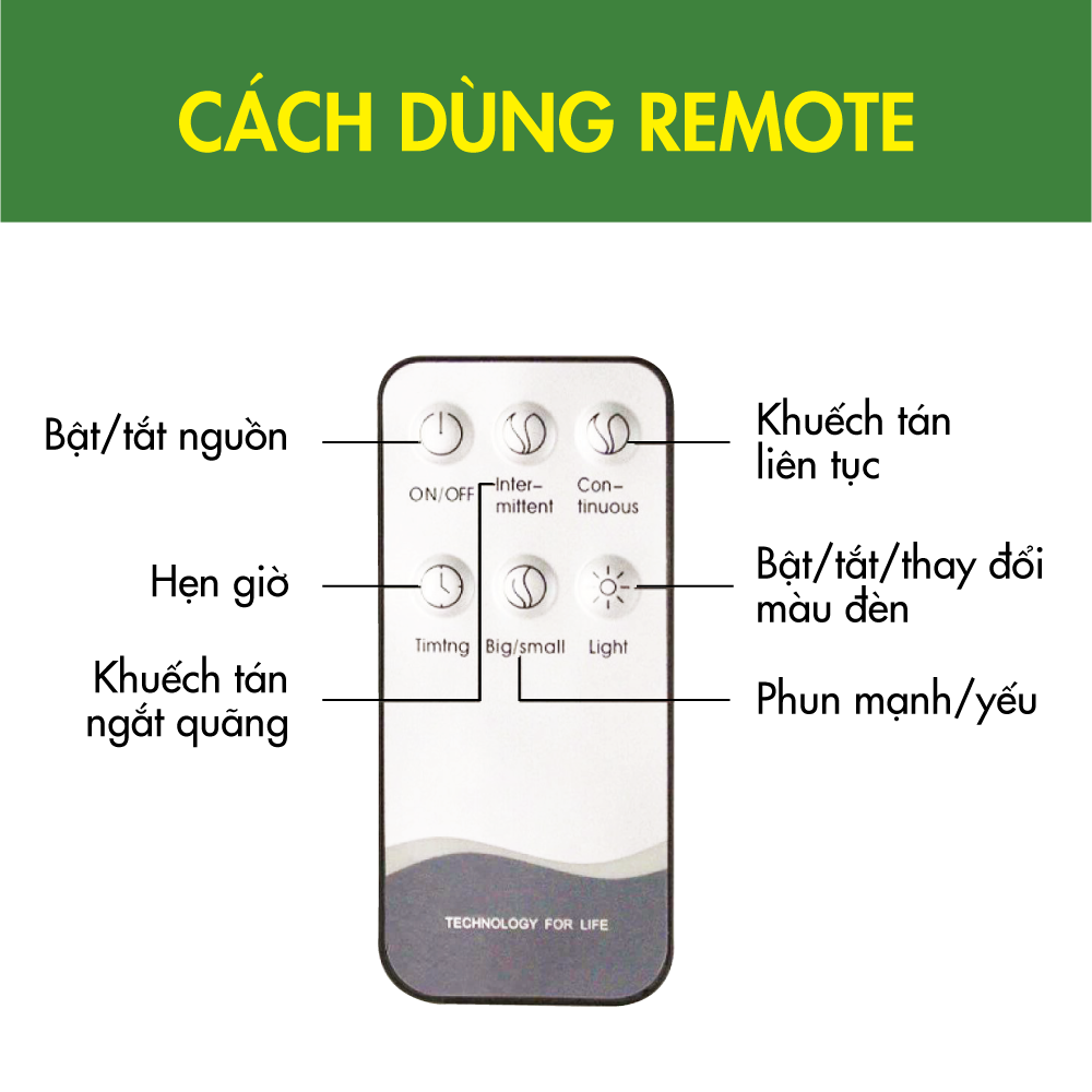 - Dễ sử dụng với nút bấm phun sương các chế độ 1h, 3h, 6h, hết nước và tự tắt.