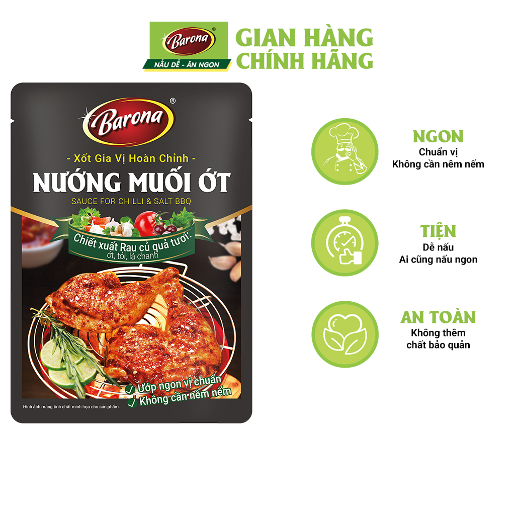 Xốt Gia Vị Hoàn Chỉnh Barona Nướng Muối Ớt có thể dùng cho thịt gà, thịt ba chỉ, tôm, cá, mực. Thịt gà nên sử dụng gà ta/ gà thả vườn sẽ ngon hơn.