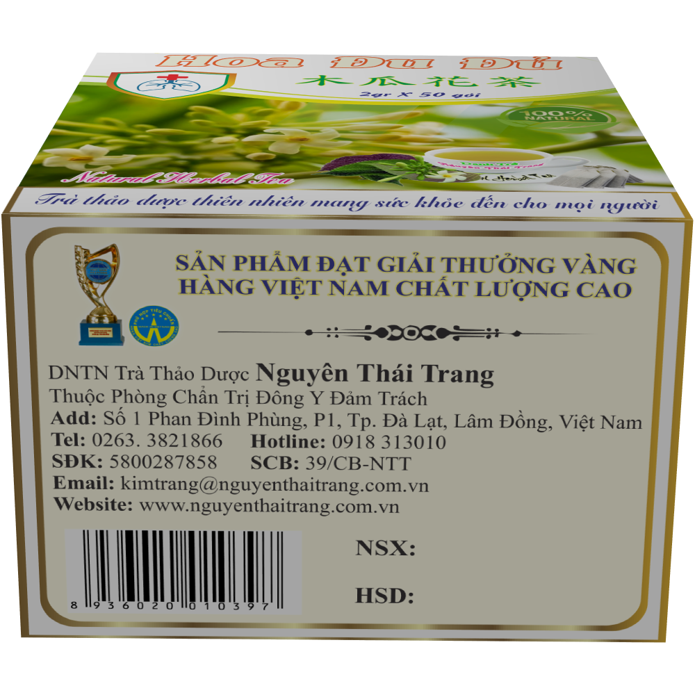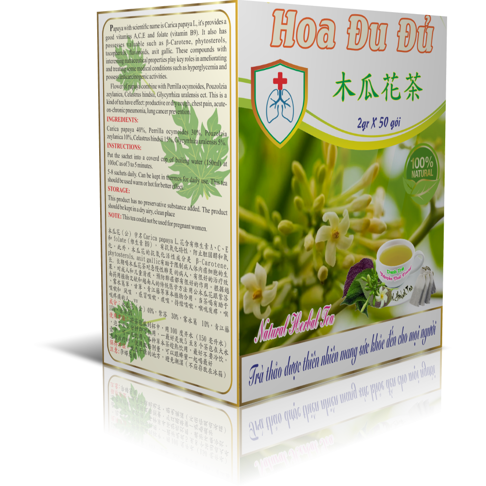 TRÀ HOA ĐU ĐỦ      Hoa Đu Đủ (đực) có tên khoa học là Carica papaya L, Trong hoa có chứa vitamin A, C, E và folate (vitamin B9) có đặc tính chống oxy hóa, ngăn ngừa cholesterol và quá trình oxy hoá. Ngoài ra, các hoạt chất chống oxy hoá trong hoa đu đủ như β-Carotene, flavonoids, axit gallic góp phần hạn chế sự phát triển của các tế bào ung thư trong cơ thể người bệnh. Trà Hoa Đu Đủ uống lâu ngày rất tốt cho người viên phổi cấp, mãn tính, làm sạch đờm cho người lớn và trẻ nhỏ, phòng tránh ung thư phổi. Theo tài liệu cây thuốc Việt Nam cũng  như cách dùng truyền thống của người Việt trong dân gian dùng hoa Đu Đủ đực kết hợp với các thảo dược như cây Tía Tô, cây thuốc Dòi (cây bọ mắm), Cam Thảo, Xạ Đen...vv. Dùng làm trà uống  hỗ trợ cho người bị ho, ho cảm, ho gió, ho có đờm ho lâu ngày, dai dẳng, ho ngứa cổ, đau họng…vv. THÀNH PHẦN: Hoa Đu Đủ ( Đực ) 40 %,  Cây Tía Tô  30 %, Cây Thuốc Dòi  10%, Xạ Đen   15 %   Cam Thảo 5% CÁCH DÙNG: cho túi trà vào tách nước sôi 100 độ C ( 150 ML nước ) đậy kín lại khoảng 3 đến 5 phút là dung được, cách tốt nhất cho từ 5 đến 8 túi trà vào bình thủy hãm uống trong ngày (Trà Thảo Dược nên dùng ấm sẽ cho hiệu quả tốt nhất ). Hỗ trợ bệnh thì dùng liều gấp đôi , có thể pha chung với mật ong rất tốt. BẢO QUẢN: Vì không sử dụng hóa chất bảo quản nên để hộp trà nơi khô ráo, thoáng sạch. SẢN XUẤT TẠI: DNTT Trà Thảo Dược Nguyên Thái Trang 01 Phan Đình Phùng, Phường 1, Tp. Đà Lạt, Lâm Đồng HẠN SỬ DỤNG: