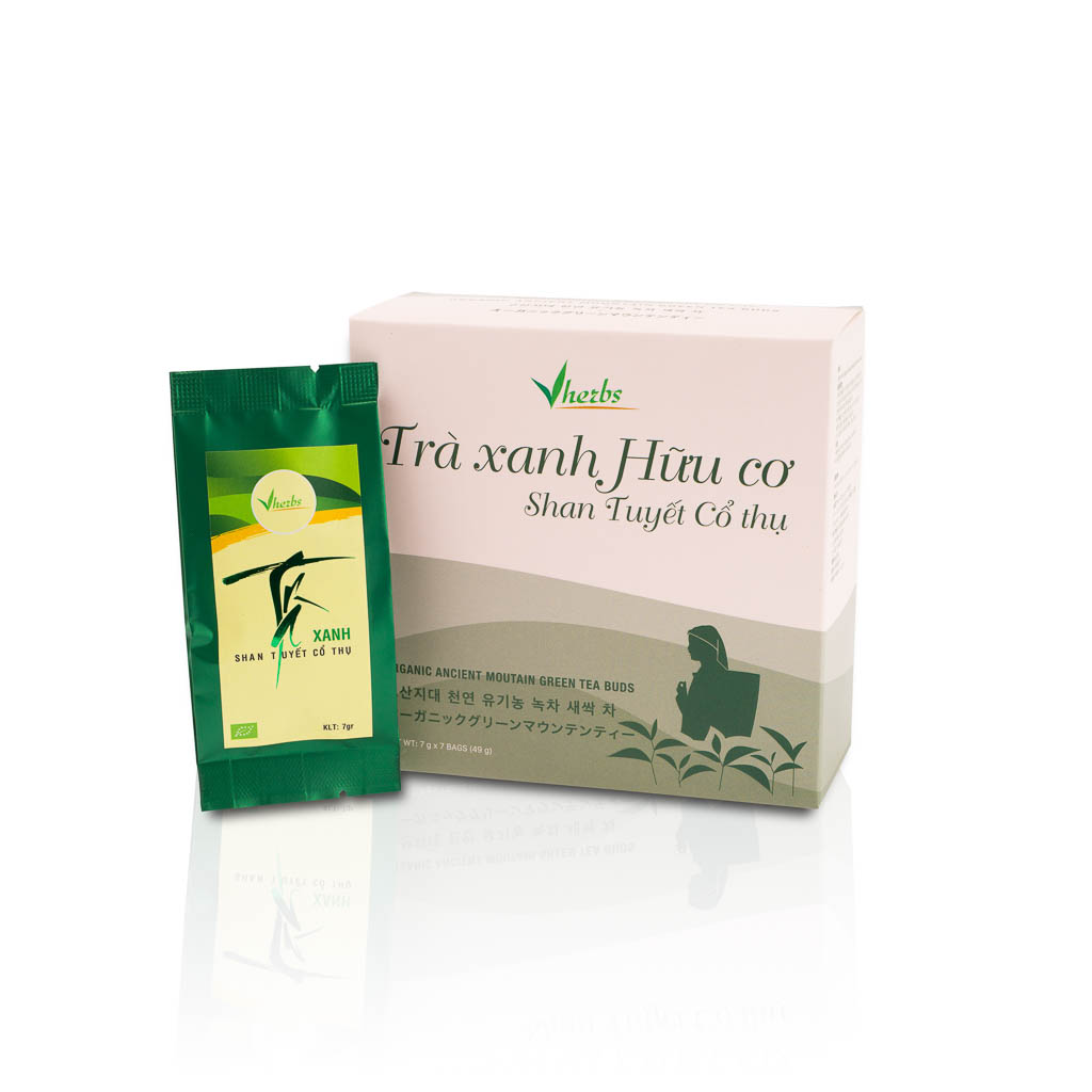 - Nước 2 là nước có vị ngon nhất . Có thể pha được từ 3 -5 lần nước. Bảo quản: Nơi khô ráo, thoáng mát. Tránh ánh sáng trực tiếp. Trà được đóng riêng từng bao, đảm bảo giữ nguyên hương vị trong suốt thời gian sử dụng Xuất xứ: Việt Nam Sản xuất tại: CÔNG TY CỔ PHẦN VIỆT HERBS Lưu ý : Không sử dụng sản phẩm khi có dấu hiệu bị ẩm mốc Giới thiệu trà hữu cơ Shan tuyết cổ thụ VHERBS Trà Shan tuyết cổ thụ Vherbs, thuộc vùng trà cổ tự nhiên hàng trăm năm tuổi trên vùng núi cao 1300 – 1900 m thuộc huyện Hoàng Su Phì, tỉnh Hà Giang. Một huyện miền núi với cung đèo đẹp nhưng cũng hiểm trở nhất của tỉnh Hà Giang. Theo kinh nghiệm gia truyền của các bậc lão niên , để có ấm trà ngon phải đảm bảo đủ các yếu tố: