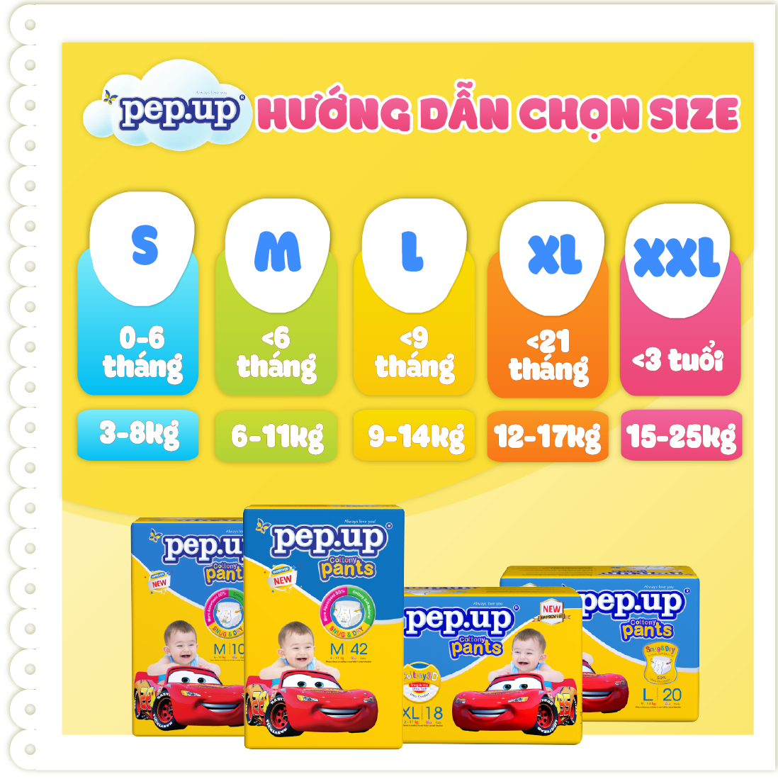 Tã/Bỉm Quần Em Bé Pep.up Cottony 3D Gói Đại Siêu Mềm Mại, Siêu Khô Thoáng, Kháng khuẩn Size S/M/L/XLI. THÔNG TIN SẢN PHẨMThương hiệu: Xuất xứ: Việt NamSản xuất tại: Công ty TNHH Javi - Lô LE6-02 Đ...