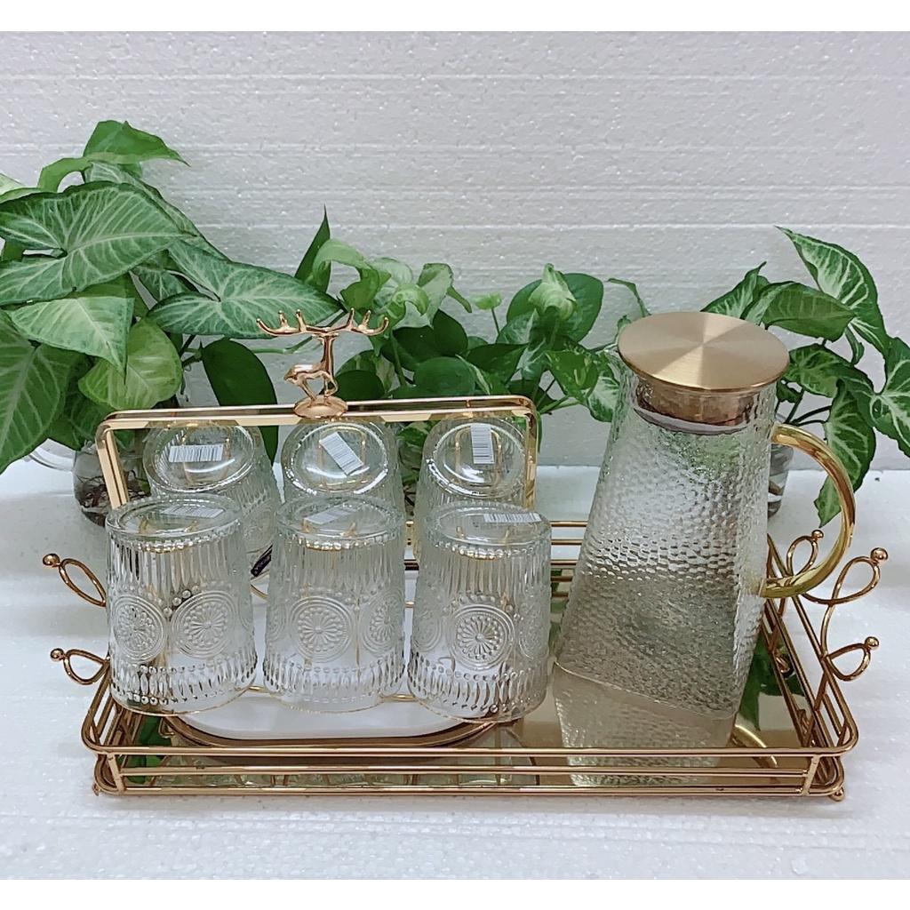 - Bộ combo Gồm 1 bình thủy tinh & 6 cốc thủy tinh HOA MẶT TRỜI 300ML + 1 khay inox tráng gương mạ vàng hình vương miện + 1 gía úp cốc kim loại mạ vàng. 2 - Bộ combo Gồm 1 bình thủy tinh & 6 cốc thủy tinh + 1 khay inox tráng gương mạ vàng hình vương miện. 3 - Bình đựng nước uống thủy tinh đáy vuông 1800ml. 4 – Khay khay inox tráng gương mạ vàng hình vương miện: 50x20,5x5cm 6 - Giá úp cốc Chất liệu kim loại. 8 – Bộ 6 cốc 360ML