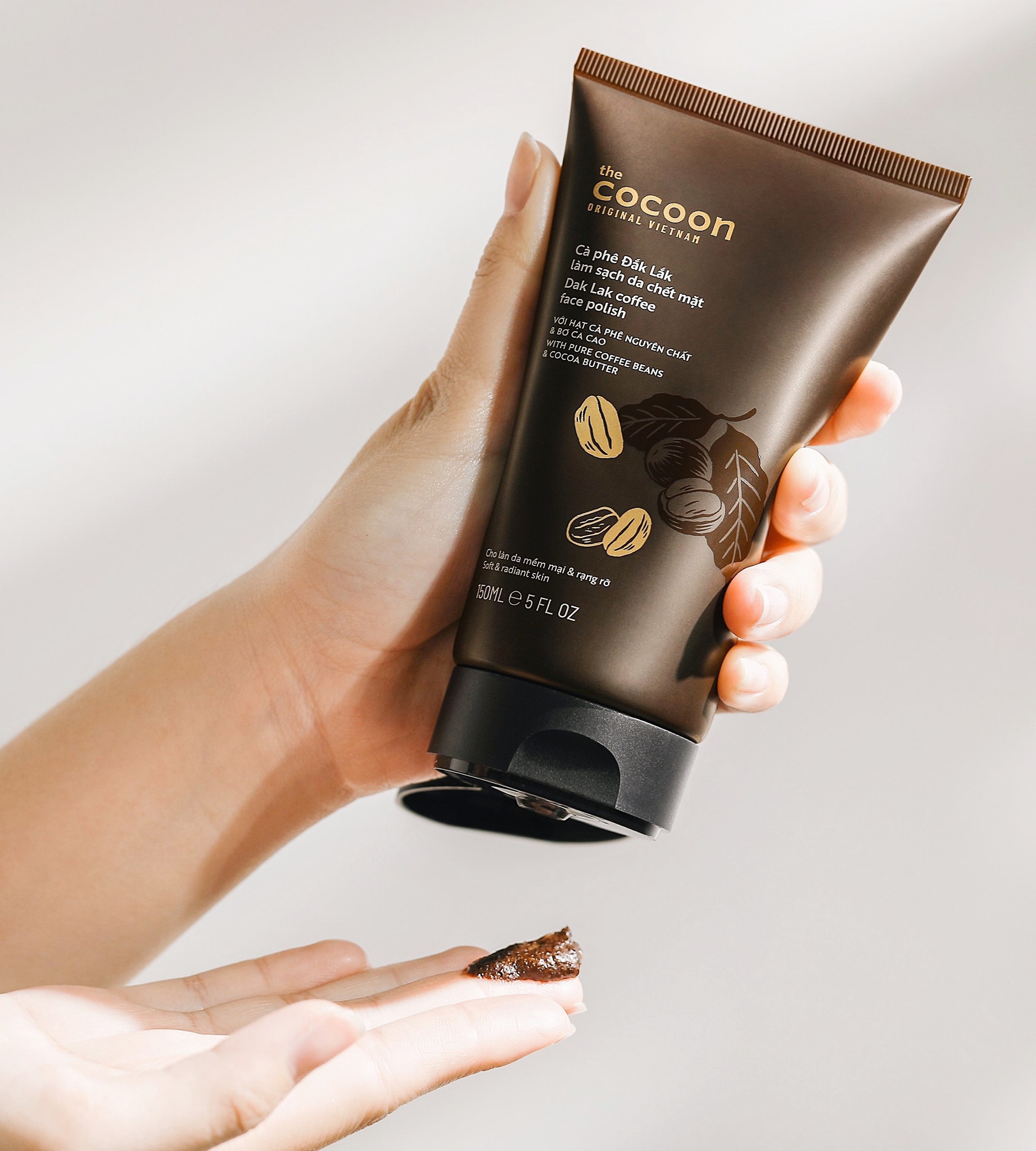 CÀ PHÊ ĐẮK LẮK LÀM SẠCH DA CHẾT MẶT COCOON 150ML Cà phê Đắk Lắk làm sạch da chết mặt là sự kết hợp giữa những hạt cà phê Đắk Lắk nguyên chất xay nhuyễn giàu cafein, hòa quyện trong bơ cao Tiền Giang, kết hợp thêm dầu hoa rum và vitamin E mang đến các công dụng ưu việt như: