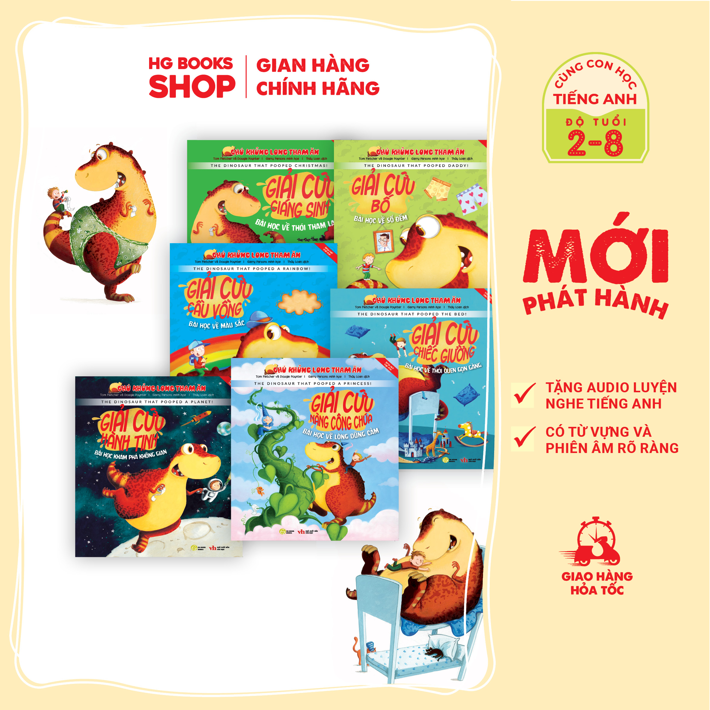 - Giải cứu bố Chú khủng long tham ăn (THE DINOSAUR THAT POOPED) dành cho lứa tuổi mẫu giáo và tiểu học (2-8 TUỔI) là thế giới đầy sắc màu của đôi bạn thân Danny và chú khủng long Dino dễ thương nhưng háu ăn. Thông qua các câu chuyện vô cùng dễ thương viết theo thể văn vần là cuốn sách tuyệt vời đọc cho các bé nghe trước giờ đi ngủ và để các bé luyện tiếng Anh một cách hiệu quả. Với nội dung hài hước, gần gũi các tình huống hằng ngày giúp bé dễ dàng ghi nhớ từ vựng, rèn luyện EQ, IQ. Bộ sách có nội dung độc đáo, nhân vật chính là chú khủng long hài hước được đan xen các bài học bổ ích cho các bé đang tuổi hình thành tính cách như: Bài học về thói tham lam, Bài học về lòng dũng cảm, Bài học về thói quen gọn gàng, ngăn nắp, Bài học khám phá không gian, Bài học về màu sắc, Bài học về số đếm. Bộ truyện tranh này đã được dịch ra hơn 33 NGÔN NGỮ. Sách luôn nằm trên bảng xếp hạng sách trẻ em được yêu thích nhất và đã bán được hơn 2,5 TRIỆU BẢN chỉ tính riêng tại Vương quốc Anh. ✷ CAM KẾT TỪ HG BOOKS ️ Sản phẩm bản quyền 100% ️ Sách thật với giá tốt ️ Tư vấn hỗ trợ quý khách hàng 24/7 ️ Đóng gói cẩn thận trước khi vận chuyển ️ Hỗ trợ gói làm quà tặng ️ Đảm bảo sản phẩm luôn mới 100% khi nhận hàng ️ Giao hàng nhanh chóng có ship hoả tốc