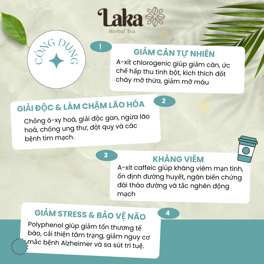 Thông tin chung : THƯƠNG HIỆU: LAKA TEA TÊN SẢN PHẨM: Combo 2 Hũ Trà Cà Phê Cascara LAKA 60gr QUÀ TẶNG : 1 Hộp Bánh hạnh nhân granola 100gr XUẤT XỨ: Việt Nam SỐ LƯỢNG và QUY CÁCH: Hộp 60gram PHÂN LOẠI : Vị bạc hà, vị cam quế DÀNH CHO: Người lớn từ 18 tuổi trở lên CÔNG DỤNG : Hỗ trợ giảm cân, đốt cháy mỡ thừa, giảm mỡ máu Hỗ trợ giải độc gan Ngăn ngừa lão hóa, chống ung thư Ổn định đường huyết, ngăn ngừa đái tháo đường QUY TRÌNH SẢN XUẤT Tại Laka Trà quả cà-phê sau khi tách hạt sẽ được khử khuẩn hoàn toàn, phơi khô, ủ men bổ sung lợi khuẩn lactobacillus với công nghệ tiên tiến độc quyền. Nhờ bàn tay nghệ nhân của xứ trà Bảo Lộc, LAKA HERBAL TEA đã tạo nên một thức trà mang tên Cascara thanh dịu và đầy dinh dưỡng. Cascara là tên gọi quốc tế của trà quả cà-phê. THÀNH PHẦN VÀ CÔNG DỤNG CHI TIẾT Chất chống ô-xy hoá cao hơn 73 lần so quả việt quất và dâu tây, hỗ trợ giải độc gan hiệu quả, giảm cholesterol hại, ngăn ngừa lão hoá, chống ung thư, đột quỵ và các bệnh tim mạch. A-xít chlorogenic hỗ trợ giảm cân tự nhiên an toàn nhờ khả năng ức chế hấp thu tinh bột và quá trình tổng hợp chất béo, đồng thời kích thích đốt cháy mỡ thừa, giảm mỡ máu. A-xit caffeic kháng viêm mạn tính, ổn định đường huyết, ngăn biến chứng đái tháo đường và tắc nghẽn động mạch. Polyphenol giúp cơ thể chống lại các gốc tự do, giảm tổn thương tế bào đồng thời cải thiện tâm trạng, giảm nguy cơ mắc bệnh Alzheimer và trì hoãn sự khởi phát sa sút trí tuệ. *** Lượng caffein trong trà Cascara thấp chỉ bằng ¼ so với hạt cà-phê nên phù hợp với mọi lứa tuổi. CÔNG NGHỆ LÊN MEN TIÊN TIẾN BỔ SUNG LỢI KHUẨN LACTOBACILLUS Các sản phẩm từ quả cà-phê của LAKA HERBAL TEA được nghiên cứu và phát triển dưới sự hợp tác của công ty Việt Thảo Nhiên và KMTG tập đoàn công nghệ sinh học hàng đầu Việt Nam, thiết bị công nghệ đạt chuẩn quốc tế. Chúng tôi là những người tiên phong tại Việt Nam đưa thành công lợi khuẩn lactobacillus vào các sản phẩm từ quả cà-phê, đem đến hiệu quả vượt trội cho sức khoẻ người tiêu dùng. Các loại trà Cascara trên thị trường hiện nay chỉ đơn thuần là tách hạt, phơi khô và đóng gói. Mặc dù quả cà-phê chứa nhiều lợi khuẩn tự nhiên nhưng cách sản xuất này khiến các hại khuẩn không được loại bỏ, nguy cơ gây hại đến hệ tiêu hoá. LAKA HERBAL TEA áp dụng công nghệ ủ men lactobacillus có định hướng: khử toàn bộ lợi khuẩn và hại khuẩn trong quả cà-phê khô, sau đó chỉ đưa vào lợi khuẩn lactobacillus sống và thuần chủng. Đây là lợi khuẩn được khoa học chứng minh có nhiều lợi ích cho hệ tiêu hoá, giúp giảm cân và giảm mỡ bụng hiệu quả. Trà Cascara LAKA HERBAL TEA chính là tâm huyết của người con xứ trà Bảo Lộc, mong muốn đưa món quà sức khoẻ của Thượng Đế đến với mọi người bằng công nghệ khoa học tiên tiến nhất hiện nay.