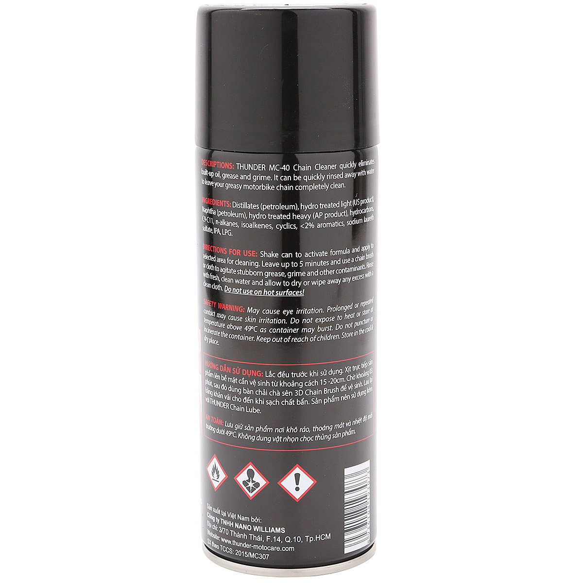 - Sản phẩm xịt rửa sên Thunder Chain Cleaner MC40 nhanh chóng tẩy sạch dầu; mỡ nhờn bám trên bề mặt sên