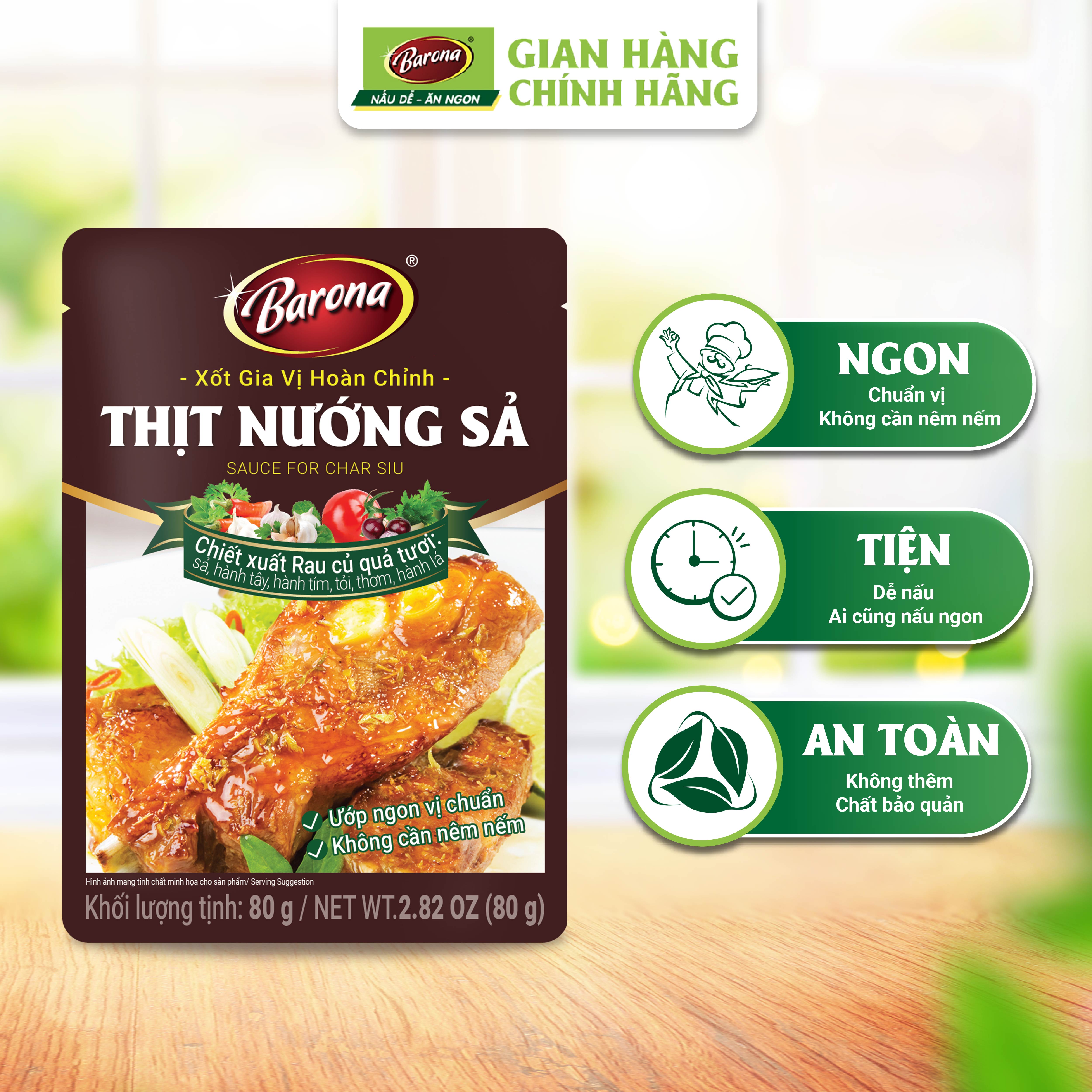 XỐT GIA VỊ HOÀN CHỈNH BARONA THỊT NƯỚNG XÁ XÍU 80G Xốt Gia Vị Hoàn Chỉnh Barona là công thức phối trộn độc đáo giữa CHIẾT XUẤT RAU CỦ QUẢ TƯƠI như hành, tỏi, me,