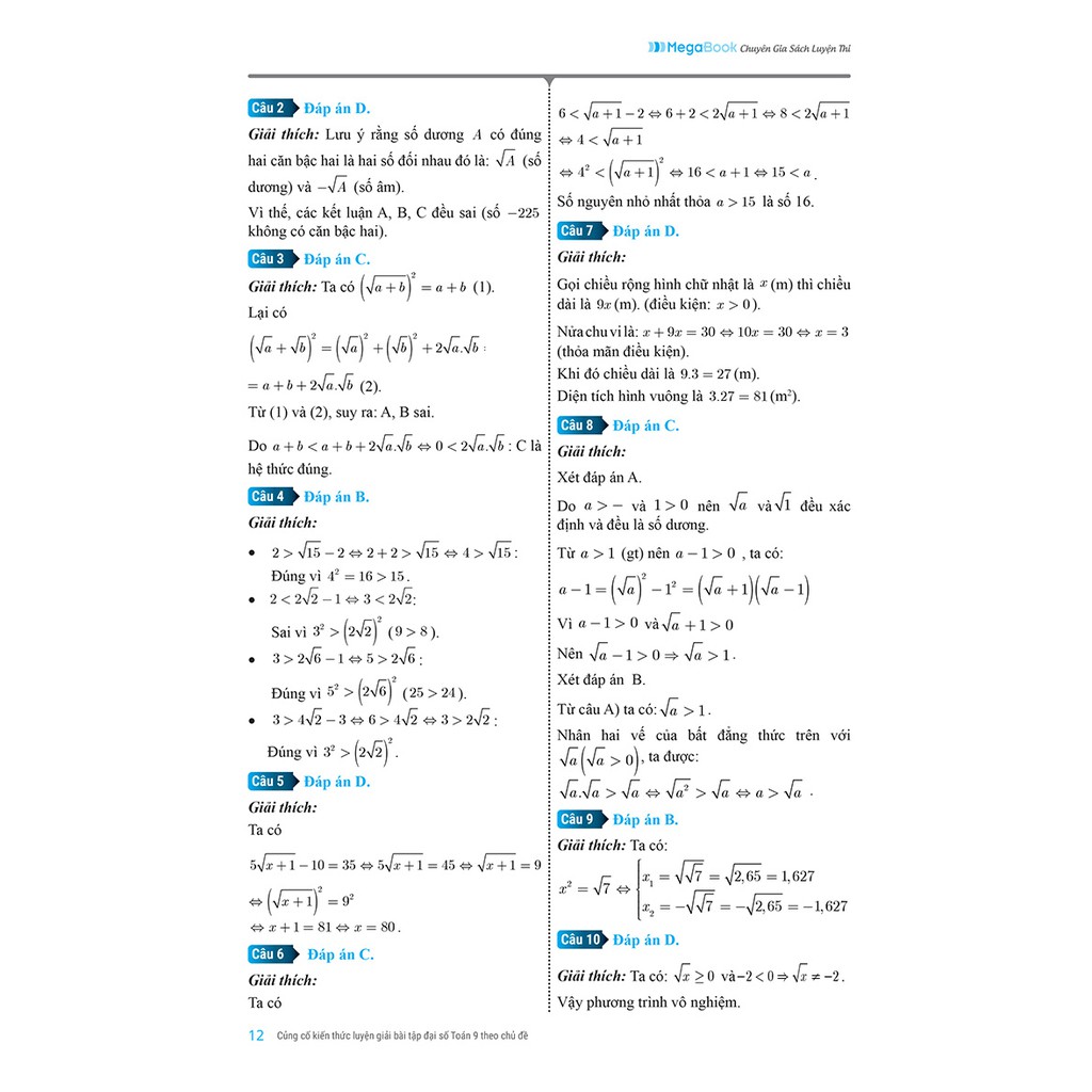 Củng cố kiến thức luyện giải bài tập đại số 9 là cuốn sách tổng hợp 4 chương với 20 chủ đề kiến thức trọng tâm của chương trình Đại số 9. Những ƯU ĐIỂM nổi bật của cuốn sách: 1. Cuốn sách tổng hợp hệ thống kiến thức cơ bản cần nhớ qua 4 chương và 20 chủ đề trọng tâm của chương trình đại số 9 như: Căn bậc 2, căn bậc 3, hàm số bậc nhất, … 2. Cuốn sách xây dựng mục tiêu tổng quát cho từng chủ đề, về cả kỹ năng và kiến thức, giúp các em xác định được trọng tâm kiến thức cần đạt được sau mỗi bài học. Sau mỗi chương sẽ có bài kiểm tra tổng quát, giúp các em tự đánh giá được năng lực của bản thân. 3. Bài tập minh họa cụ thể, đa dạng sau mỗi phần kiến thức cơ bản, giúp vận dụng được kiến thức một cách tối đa vào từng dạng bài, từ đó học sâu, nhớ lâu kiến thức. 4. Bài tập tự luyện giúp rèn luyện kỹ năng giải toán dưới 2 hình thức tự luận và trắc nghiệm. Đi kèm sau đó là lời giải chi tiết cho từng bài 5. Kiến thức đi từ cơ bản đến nâng cao, lời giải siêu chi tiết cho từng bài từ đó phù hợp với học lực của từng học sinh kể cả trung bình – khá. Với những ƯU ĐIỂM trên, cuốn sách chắc chắn sẽ trở thành người bạn đồng hành đắc lực, giúp các em học sinh lớp 9 chinh phục thành công môn Đại số.
