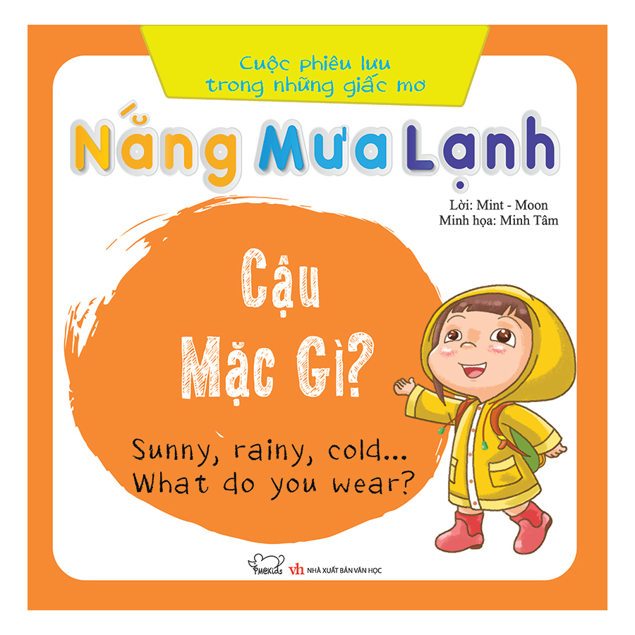 Nắng, Mưa, Lạnh... Cậu mặc gì: Là câu chuyện về bạn Moon trời lạnh mà vẫn không chịu mặc quần áo ấm, Moon chỉ thích những bộ váy mùa hè bồng bềnh như những nàng công chúa. Trong giấc mơ, Moon đã gặp gỡ các bạn áo, quần, khăn và tất. Các bạn ấy vây quanh Moon khuyên nhủ trời lạnh, Moon phải mặc áo ấm kẻo bị ốm đấy. Các bé nhớ nhé, mùa nào thì phải mặc đúng quần áo của mùa đấy,mùa đông, gió lạnh, các bé cần phải mặc quần áo thật ấm, mùa hè nóng bức, khi đi ra ngoài, các bé nhớ mang theo mũ nhé.