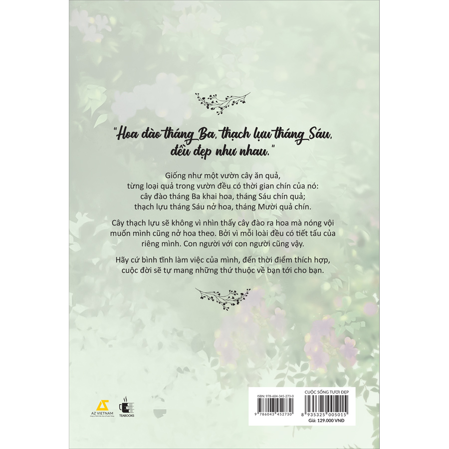 “Hoa đào tháng ba, thạch lựu tháng Sáu, đều đẹp như nhau.” Giống như một vườn cây ăn quả, từng loại quả trong vườn đều có thời gian chín của nó: cây đào tháng Ba khai hoa, tháng Sáu chín quả; thạch lựu tháng Sáu nở hoa, tháng Mười quả chín. Cây thạch lựu sẽ không vì nhìn thấy cây đào ra hoa mà nóng vội muốn mình cũng nở hoa theo. Bởi vì mỗi loài đều có tiết tấu của riêng mình. Con người với con người cũng vậy. Hãy cứ bình tĩnh làm việc của mình, đến thời điểm thích hợp, cuộc đời sẽ tự mang những thứ thuộc về bạn tới cho bạn.