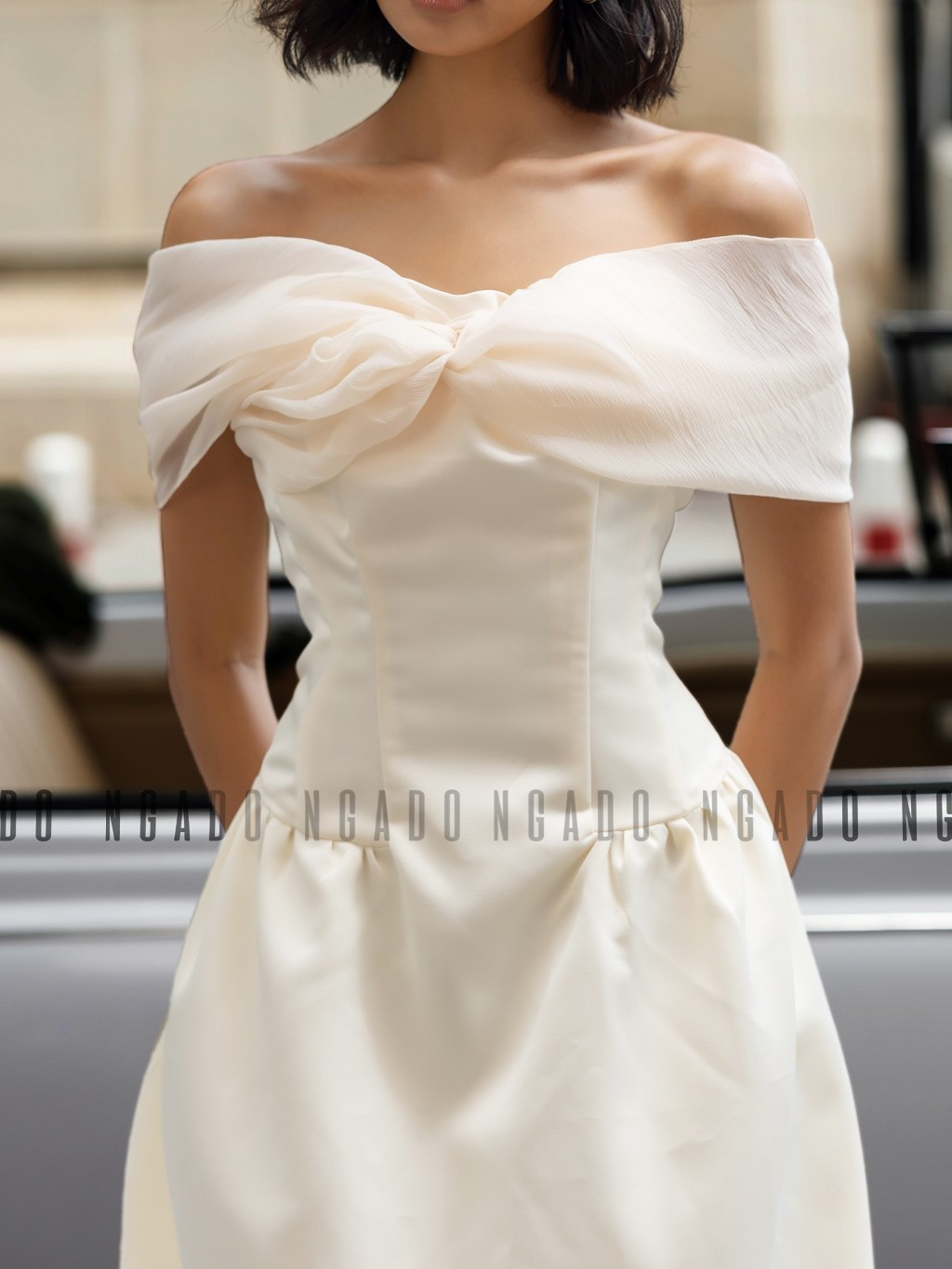 ✨Đầm bẹt vai phối voan kem NGADO, Đầm dự tiệc sang chảnh, Đầm hở vai