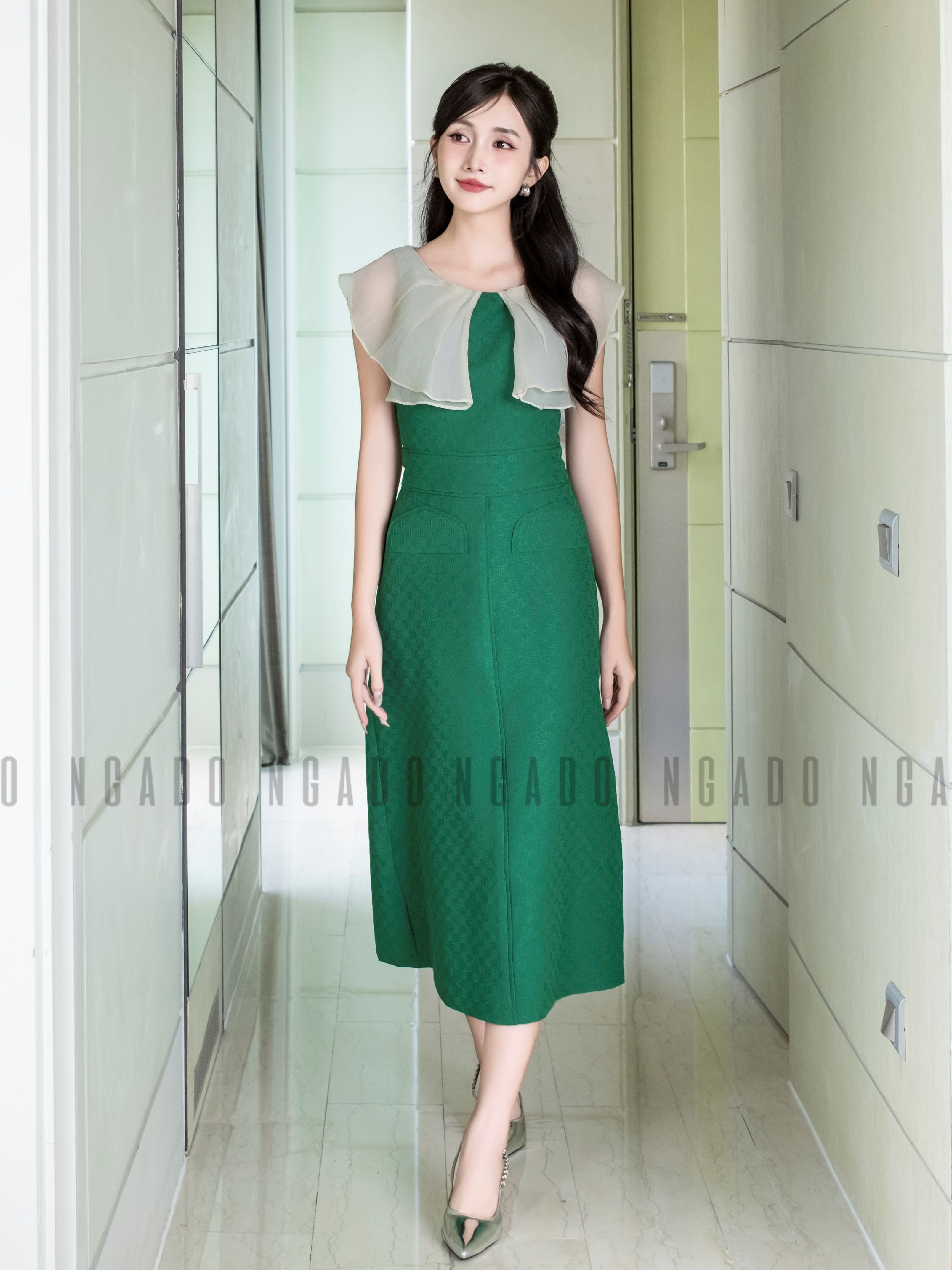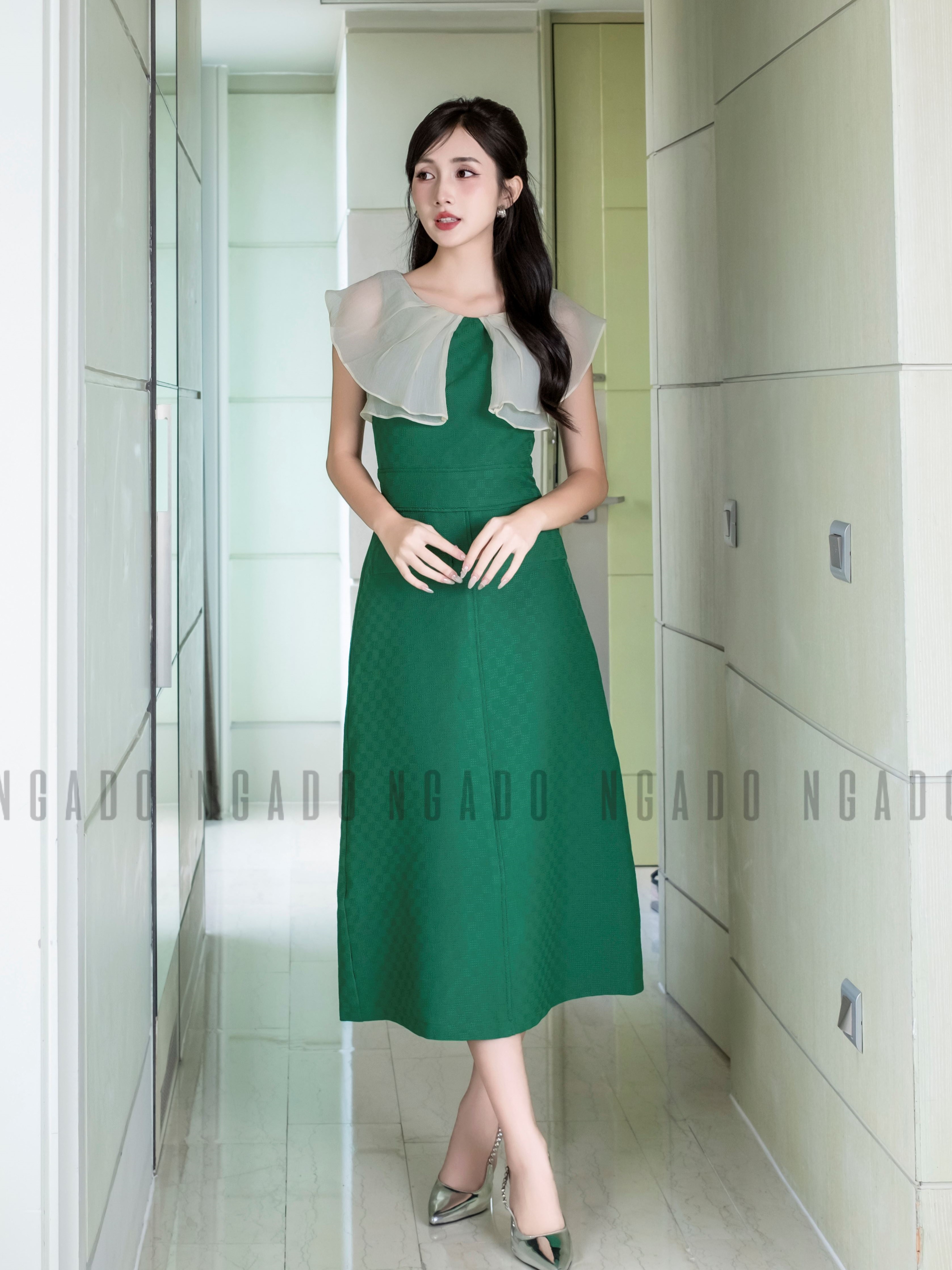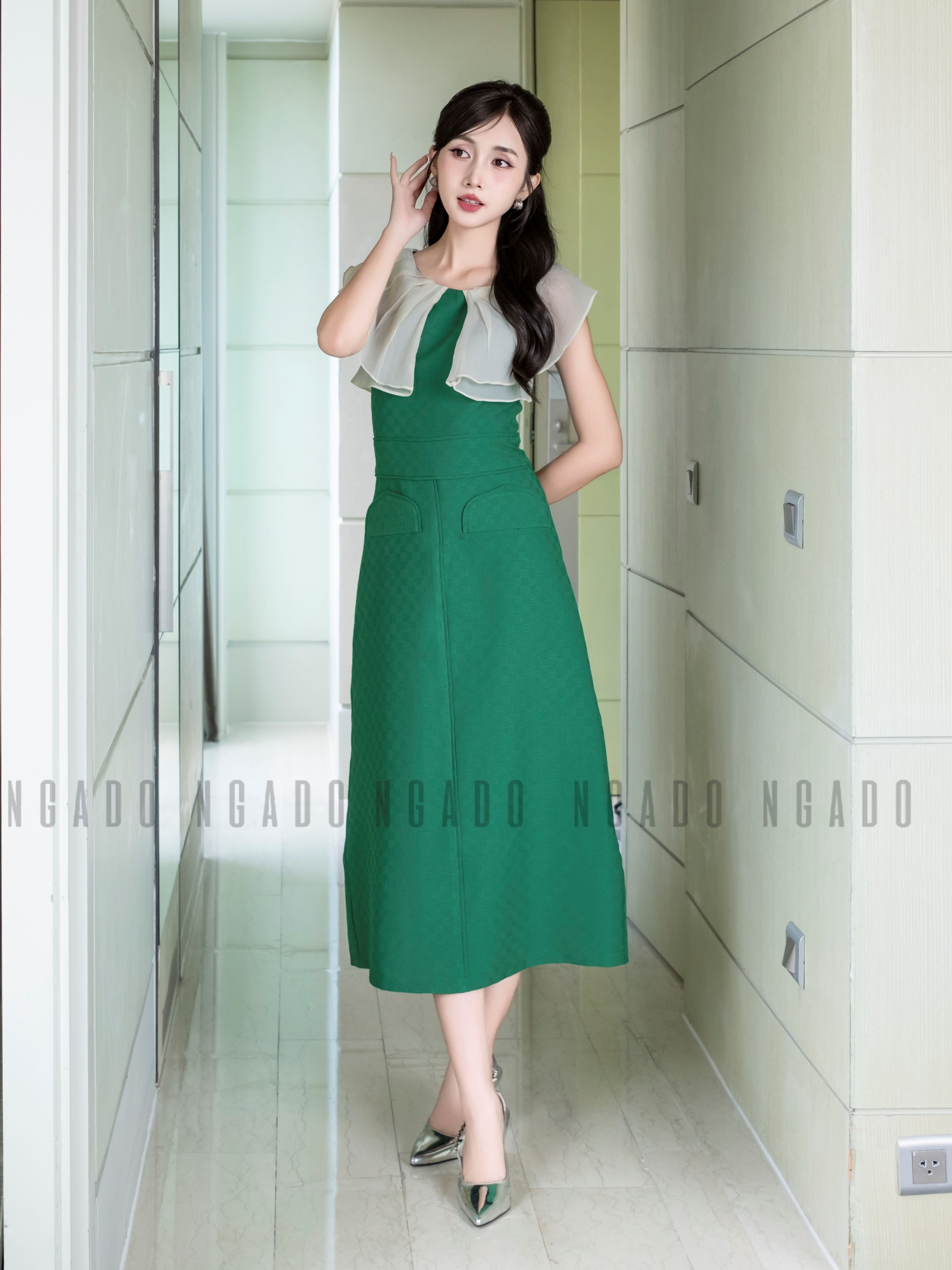 ✨Đầm xanh phối voan kem NGADO , Đầm dự tiệc , Đầm dạo phố