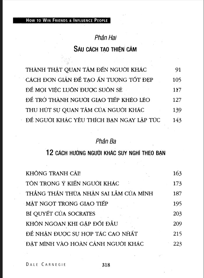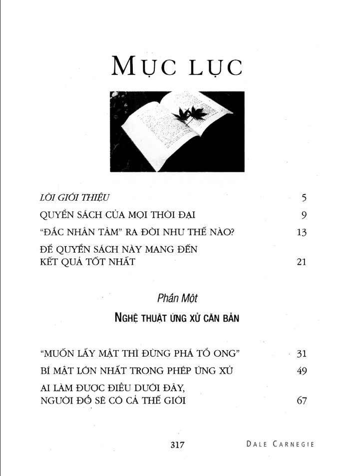 Đắc Nhân Tâm   Đắc Nhân Tâm của Dale Carnegie là quyển sách của mọi thời đại và một hiện tượng đáng kinh ngạc trong ngành xuất bản Hoa Kỳ. Trong suốt nhiều thập kỷ tiếp theo và cho đến tận bây giờ, tác phẩm này vẫn chiếm vị trí số một trong danh mục sách bán chạy nhất và trở thành một sự kiện có một không hai trong lịch sử ngành xuất bản thế giới và được đánh giá là một quyển sách có tầm ảnh hưởng nhất mọi thời đại. Đây là cuốn sách độc nhất về thể loại self-help sở hữu một lượng lớn người hâm mộ. Ngoài ra cuốn sách có doanh số bán ra cao nhất được tờ báo The New York Times bình chọn trong nhiều năm. Cuốn sách này không còn là một tác phẩm về nghệ thuật đơn thuần nữa mà là một bước thay đổi lớn trong cuộc sống của mỗi người. Nhờ có tầm hiểu biết rộng rãi và khả năng ‘ứng xử một cách nghệ thuật trong giao  tiếp’ – Dale Carnegie đã viết ra một quyển sách với góc nhìn độc đáo và mới mẻ trong giao tiếp hàng ngày một cách vô cùng thú vị – Thông qua những mẫu truyện rời rạc nhưng lại đầy lý lẽ thuyết phục. Từ đó tìm ra những kinh nghiệm để đúc kết ra những nguyên tắc vô cùng ‘ngược ngạo’, nhưng cũng rất logic dưới cái nhìn vừa sâu sắc, vừa thực tế.  Hơn thế nữa, Đắc Nhân Tâm còn đưa ra những nghịch lý mà từ lâu con người ta đã hiểu lầm về phương hướng giao tiếp trong mạng lưới xã hội, thì ra, người giao tiếp thông minh không phải là người có thể phát biểu ra những lời hay nhất, mà là những người học được cách mỉm cười, luôn biết cách lắng nghe, và khích lệ câu chuyện của người khác.  Cuốn sách Đắc Nhân Tâm được chia ra làm 4 nội dung chính và mỗi phần cũng là một bài học về cuộc sống. Phần 1: Nghệ thuật ứng xử cơ bản Không nên trách móc và than phiền, thù oán Muốn lấy được mật ong thì không nên phá tổ Trách móc một người nào đó là một việc dễ dàng. Thay vào đó, bạn hãy ngó lơ sự phán xét đó mà rộng lượng. Đồng thời tha thứ cho người đó và bỏ qua hết mọi chuyện thì mới đáng được tự hào. Biết khen ngợi và nhận được ơn nghĩa của người khác mới là bí mật lớn nhất về phép cư xử. Bạn cần phải biết khen ngợi và biết ơn người khác một cách thành thật nhất, chính là chìa khóa tạo nên tình nhân ái. Phần 2:  Bạn nên thật lòng quan tâm đến người khác Mỉm cười đó là cách để tạo ấn tượng tốt nhất Hay ghi nhớ lấy tên của người bạn đã và đang giao tiếp với bạn Bạn nên lắng nghe và khuyến khích người khác để trở thành người có khả năng giao tiếp cao Hãy nói về cái mà người khác để ý sẽ thu hút được người đó Phần 3: Cách hướng người khác làm theo suy nghĩ của mình Không được để ra tranh cãi và cách giải quyết tốt nhất đó là không nên để nó xảy ra Tôn trọng ý kiến của mọi người, không bao giờ được nói người khác sai Thừa nhận được sai làm của mình, nếu phạm phải thì bạn cần phải thừa nhận điều đó Bạn cần phải hỏi những câu hỏi cần thiết để họ trả lời bạn bằng tiếng vâng ngay lập tức Khi nói chuyện bạn hãy để cho đối phương cảm nhận được họ làm chủ trong câu chuyện Để nhận được sự hợp tác thì bạn cần phải để họ nghĩ họ là người đưa ra ý tưởng Bạn cần phải đặt mình vào hoàn cảnh của họ để có thể hiểu hết về bản thân của họ Bạn hãy đồng cảm với mong muốn của mọi người Trong cuộc sống bạn hãy gợi lên sự cao thượng Thân thiện trong giao tiếp đó chính là sử dụng mật ngọt để bắt đầu được câu chuyện Bạn nên trình bày một cách rõ ràng và sinh động nhất Trong cuộc sống bạn cần phải vượt lên được thử thách Phần 4: Chuyển hóa được con người và không tạo lên sự oán hận và chống đối Trước khi phê bình người khác bạn hãy khen ngợi người đó Khi phê bình bạn nên phê bình một cách gián tiếp Bạn nên khen ngợi người khác để có được một cuộc sống xứng đáng Bạn nên mở đường cho người khác để khắc phục sai lầm Bạn nên tôn vinh người khác khi nói chuyện Trước khi phê bình người khác thì bạn nên nhìn nhận lại bản thân của mình Thay vì ra lệnh cho người khác thì bạn hãy gợi ý cho họ Trong mọi chuyện bạn nên giữ thể diện cho người khác Bạn cần phải lưu ý những mối quan hệ của mình Về tác giả Dale Breckenridge Carnegie (24 tháng 11 năm 1888 – 1 tháng 11 năm 1955) là một nhà văn và nhà thuyết trình Mỹ và là người phát triển các lớp tự giáo dục, nghệ thuật bán hàng, huấn luyện đoàn thể, nói trước công chúng và các kỹ năng giao tiếp giữa mọi người. Ra đời trong cảnh nghèo đói tại một trang trại ở Missouri, ông là tác giả cuốn Đắc Nhân Tâm, được xuất bản lần đầu năm 1936, một cuốn sách thuộc hàng bán chạy nhất và được biết đến nhiều nhất cho đến tận ngày nay.  Ông cũng viết một cuốn tiểu sử Abraham Lincoln, với tựa đ