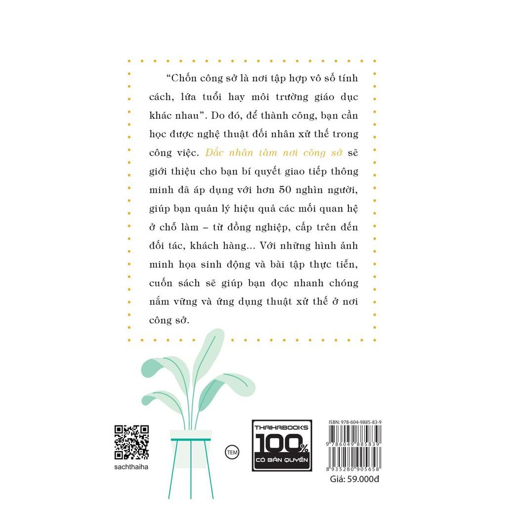 Đời sống công việc mang đến cho chúng ta không ít muộn phiền. Trải qua quá trình xin việc gian nan, dù vào được công ty mong muốn nhưng công việc không thuận lợi, mối quan hệ với đồng nghiệp không tốt. Khi đi học, bạn có thể chọn bạn để chơi nhưng khi đi làm, mọi chuyện không đơn giản như vậy. Chốn công sở là nơi tập hợp vô số kiểu người, khác thế hệ, khác tính cách, khác cả môi trường giáo dục. Chắn chắn khi làm việc cùng họ, bạn ít nhiều sẽ bị căng thẳng. Khi đó, bạn có định chiến đấu với cảm xúc tiêu cực và giải quyết nỗi căng thẳng không? Nếu bạn vẫn đang gặp những phiền muộn trong các mối quan hệ nơi công sở và cũng chưa tìm ra phương pháp thì hãy tìm đọc Đắc nhân tâm nơi công sở - cuốn sách sẽ giới thiệu cho bạn bí quyết giao tiếp thông minh đã áp dụng với hơn 50 nghìn người, giúp bạn quản lý hiệu quả các mối quan hệ tại nơi làm việc – từ đồng nghiệ, cấp trên đến đối tác, khách hàng… Với những hình ảnh minh họa sinh động và bài tập thực tiễn, cuốn sách sẽ giúp bạn nhanh chóng nắm vững và ứng dụng thuật xử thế nơi công sở.
