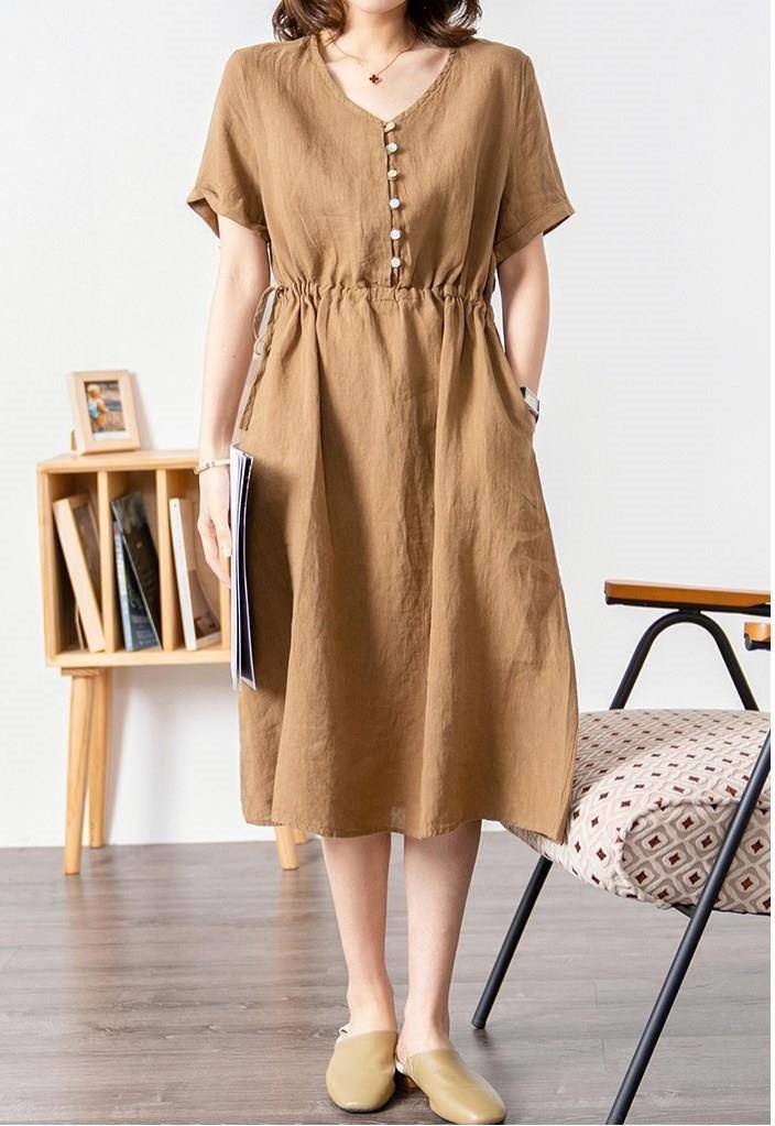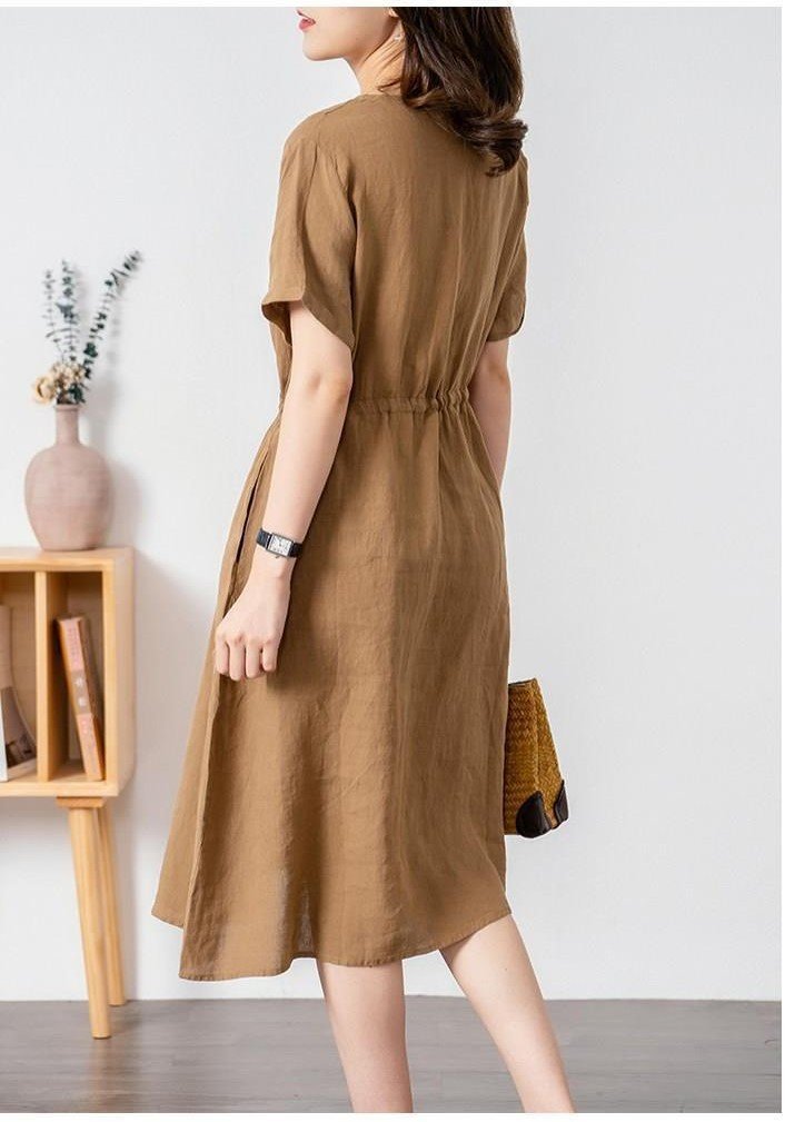 ✨Đầm nữ cổ V phong cách Hàn Quốc thanh lịch, chất linen mát, dầm có túi siêu xinh NH173 nâu