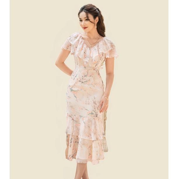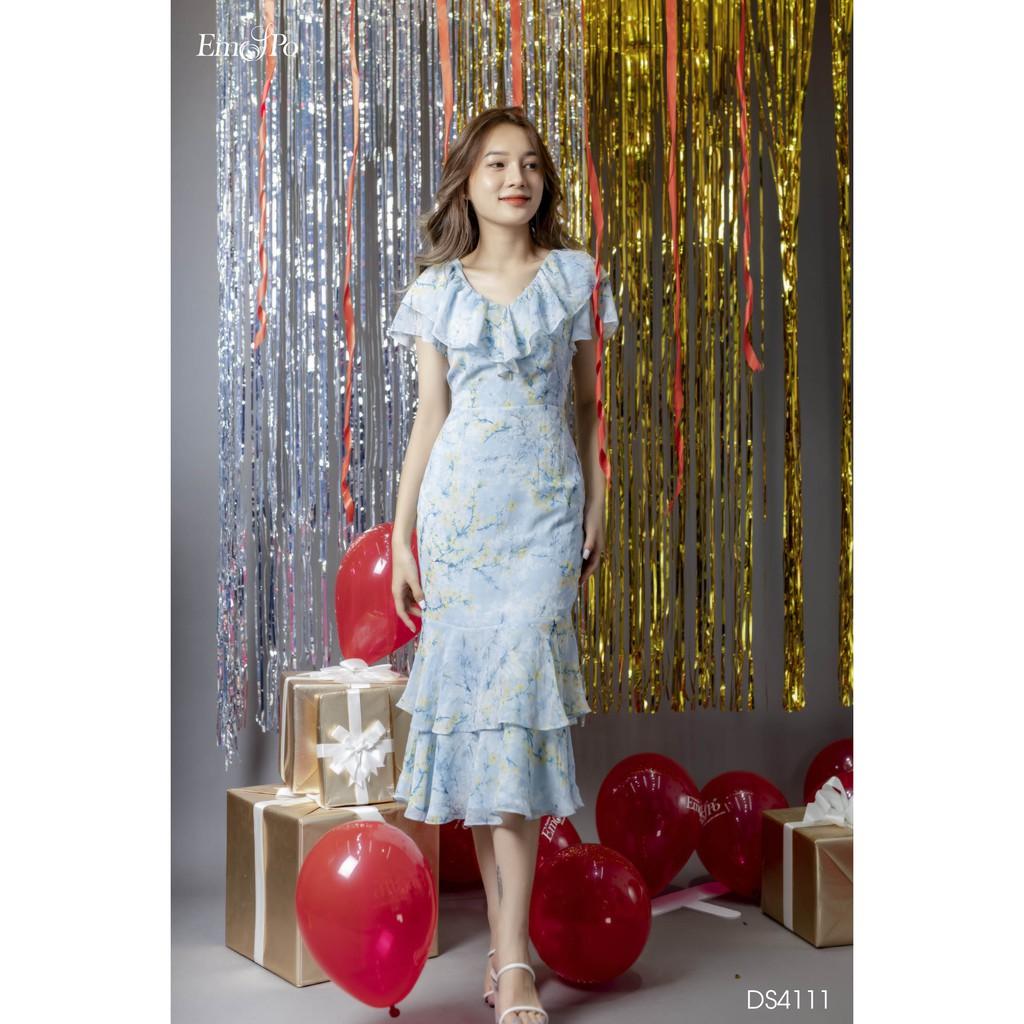 "Đầm ôm xếp tầng Emspo Milestone, cổ V viền bèo DS4111 Đầm được thiết kế trên chất liệu Chiffon họa tiết cao cấp Đầm có điểm nhấn là phần bèo cổ và phần chân váy