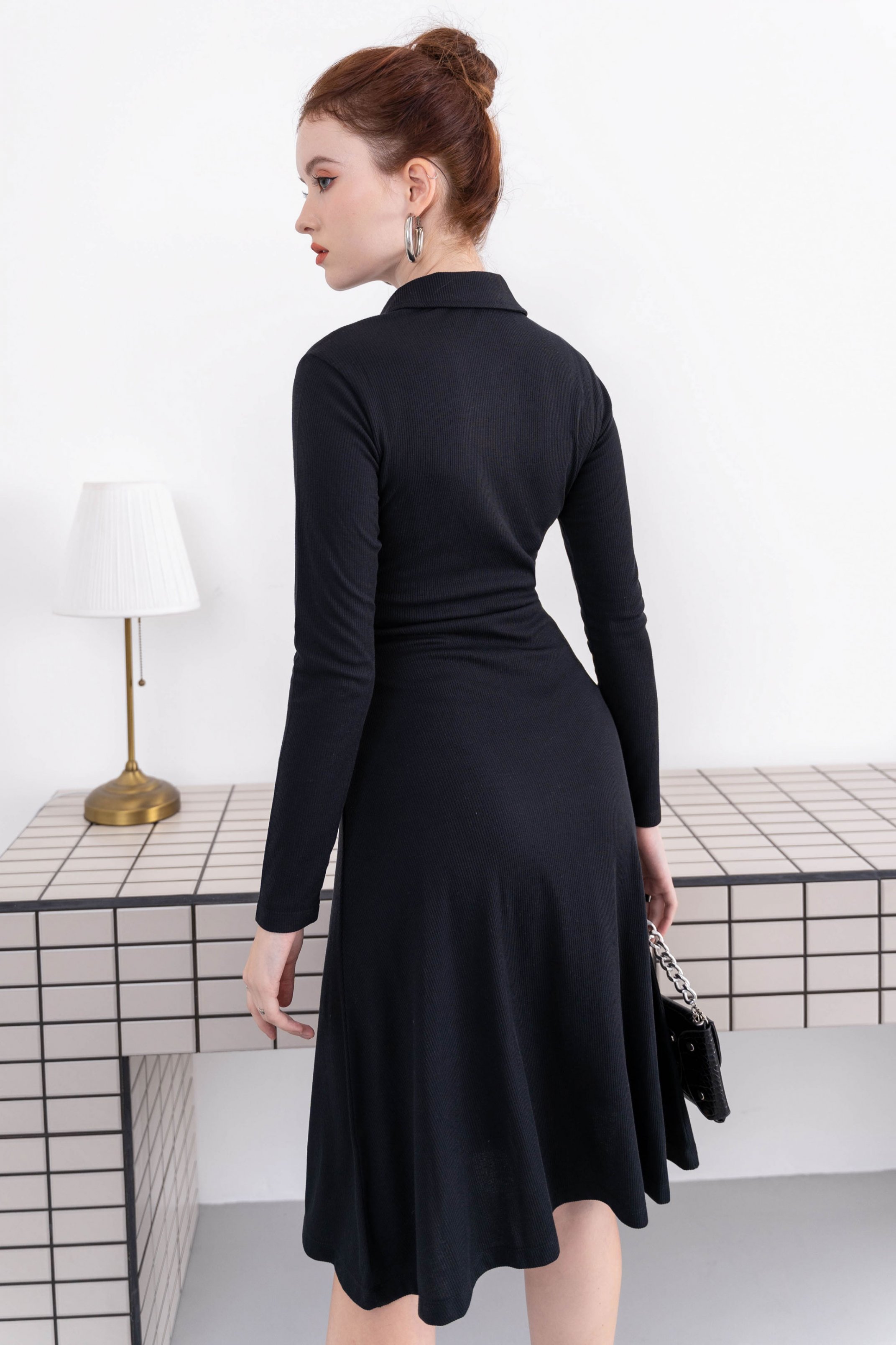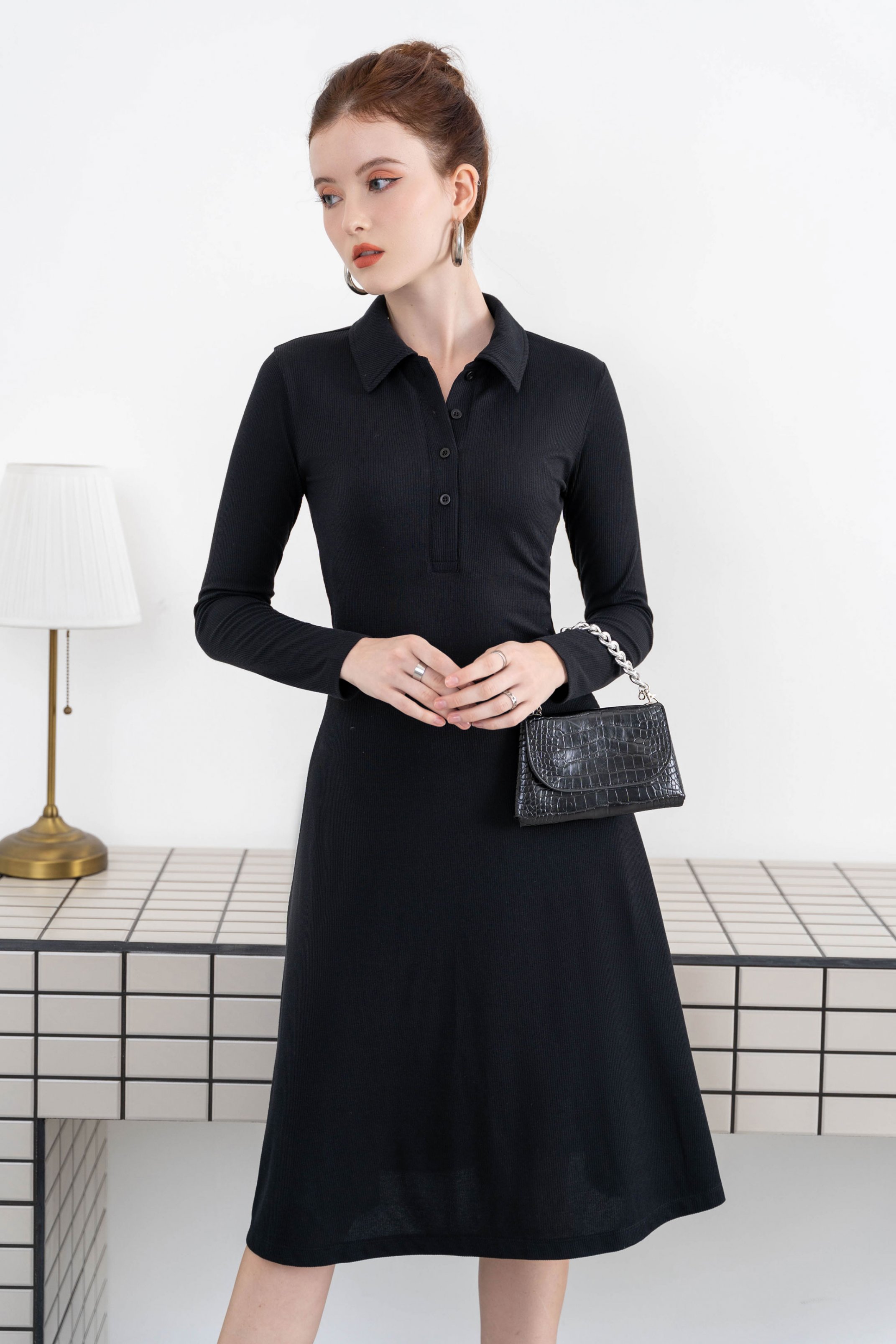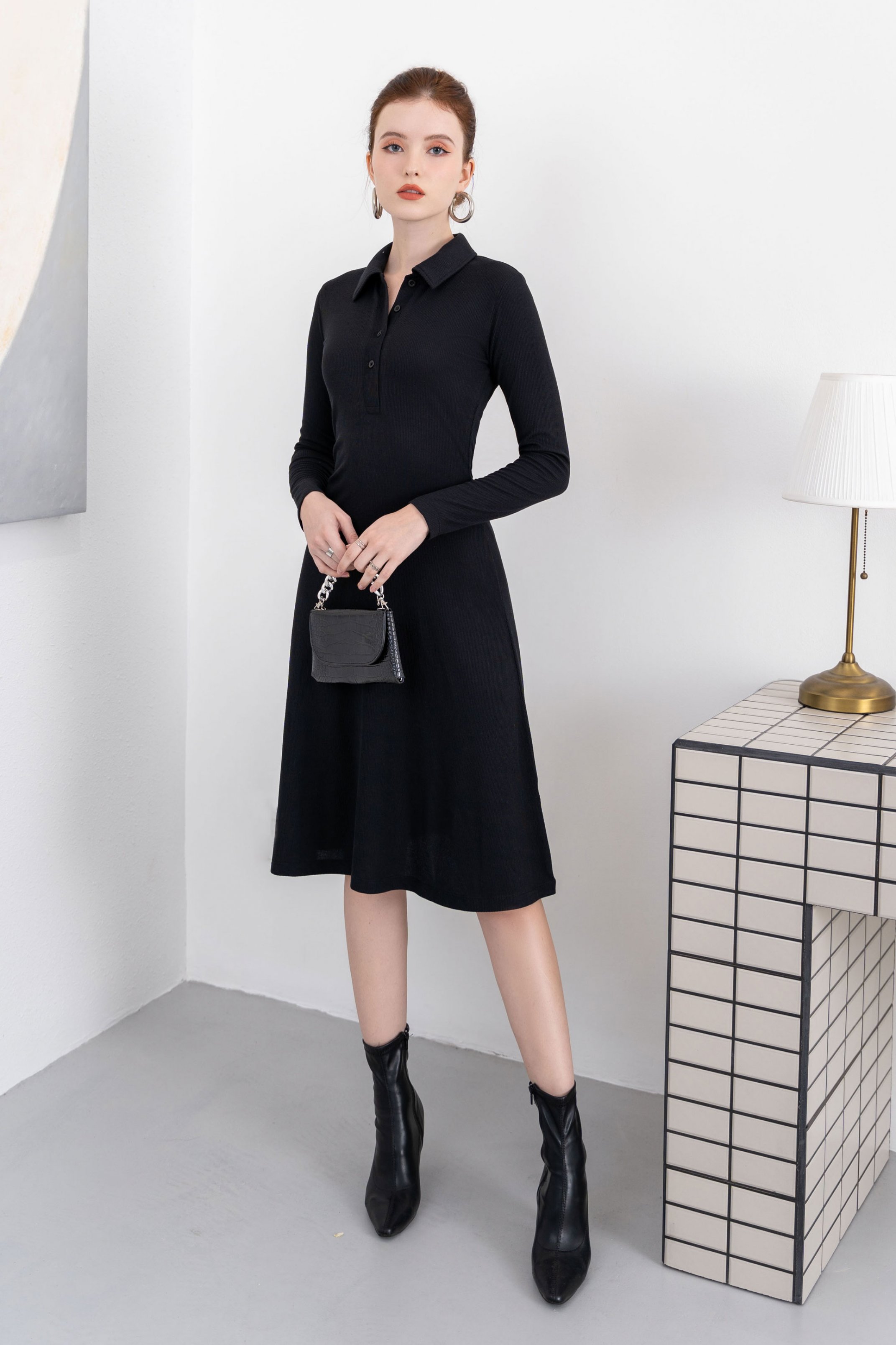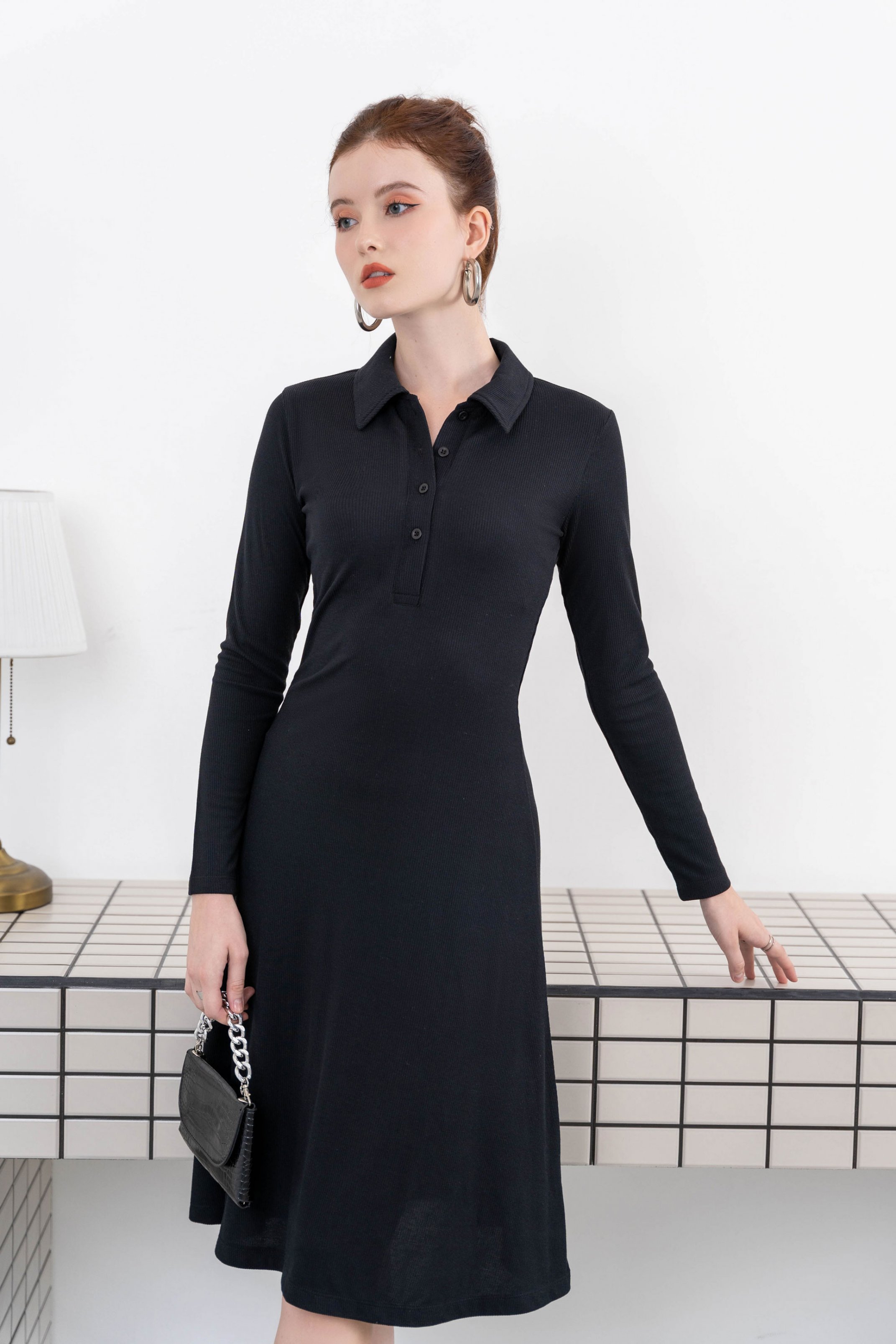CHẤT LIỆU BO GÂN SỚ NHỎ DÀY MỀM ĐẦM MÀU ĐEN, CỔ POLO NÚT GÀI FORM ÔM XÒE, TAY DÀI ĐẦM DÀI QUA GỐI ĐIỂM NHẤN LÀ CHIẾC NẸP ÁO DÀI VÀ TAG LOGO LAAS GẮN Ở LAI VÁY