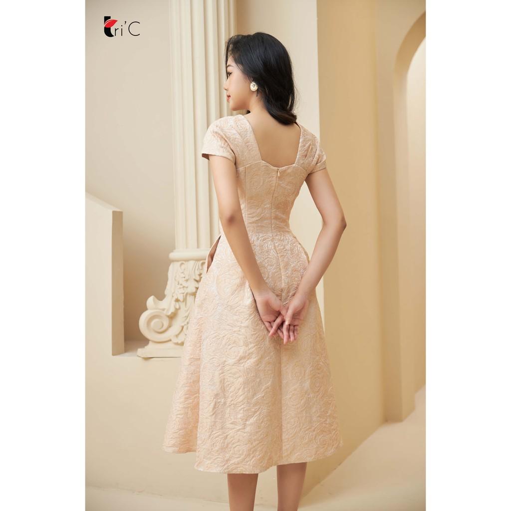 ✨Đầm xòe gấm hoa hồng nude ngực vặn xoắn Tri'C Luxury L051220