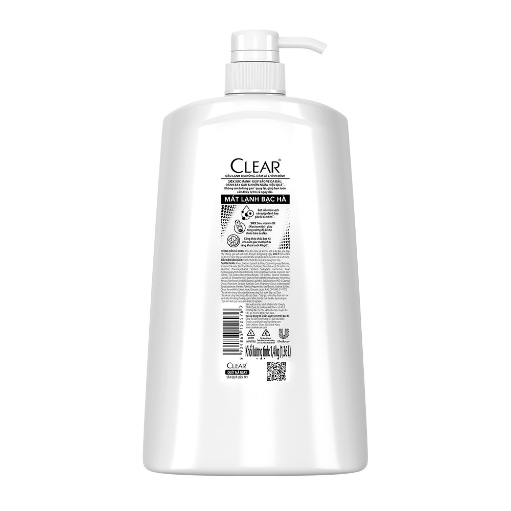 BAO BÌ THAY ĐỔI THEO TỪNG ĐỢT NHẬP HÀNG Dầu Gội Clear Sạch Gàu 1.4kg Mát Lạnh Bạc Hà 3x Sức Mạnh Đánh Bay Gàu, Ngứa, Vi Khuẩn Dầu gội sạch gàu Clear Mát Lạnh Bạc Hà 1,4kg - Clear thế hệ mới với bọt siêu mịn, giúp loại bỏ tất cả vảy gàu trên da đầu, giúp bạn tự tin, không còn lo vảy gàu xuất hiện trên tóc & vai áo - Clear thế hệ mới với 10X Niacinamide dưỡng ẩm chuyên sâu cho lớp tế bào dưới da đầu, từ đó tăng cường hàng rào bảo vệ da đầu. Khi da đầu khỏe mạnh, vi khuẩn gàu (mà luôn tồn tại trên da đầu) không dễ dàng tấn công, từ đó ngăn gàu quay lại tối đa - Công thức đã được kiểm nghiệm, không gâu kích ứng da đầu - Hiệu quả đã được kiểm nghiệm  + 97% Người tiêu dùng tin rằng gàu sẽ không trở lại + 98% Đồng ý rằng da đầu khoẻ mạnh hơn + 99% Cảm thấy mát lạnh và sảng khoái lâu hơn. *Dựa trên kiểm nghiệm với hơn 250 người Việt Nam.    ƯU ĐIỂM NỔI BẬT:  ''CÔNG THỨC SẠCH GÀU TỐT NHẤT ĐẾN TỪ CLEAR" - Bọt siêu mịn sạch sâu giúp đánh bay gàu & bã nhờn*. - 10X Siêu vitamin B3 (Niacinamide)+ giúp tăng cường độ ẩm tự nhiên trên da đầu. - Công thức chứa bạc hà cho bạn cảm giác mát lạnh sảng khoái sau mỗi lần gội và kéo dài suốt 48 giờ + So với hàm lượng Niacinamide⁺ trong công thức trước đây của Clear.  Vảy gàu nhìn thấy được trên tóc và da đầu khi dùng thường xuyên. Nhờn trên bề mặt da đầu. Ngứa do gàu. (Dựa trên kết quả trong điều kiện thí nghiệm)  HƯỚNG DẪN SỬ DỤNG:  Thoa đều dầu gội lên tóc & da đầu, xoa bóp nhẹ nhàng, gội sạch với nước. Khuyên dùng hàng ngày.  CHÚ Ý:  Để xa tầm tay trẻ em, tránh tiếp xúc với mắt. Nếu sản phẩm dính vào mắt, rửa kĩ với nước.  ĐIỀU KIỆN BẢO QUẢN:  Tránh nhiệt độ cao & ánh nắng trực tiếp. hiệu quả trông thấy.