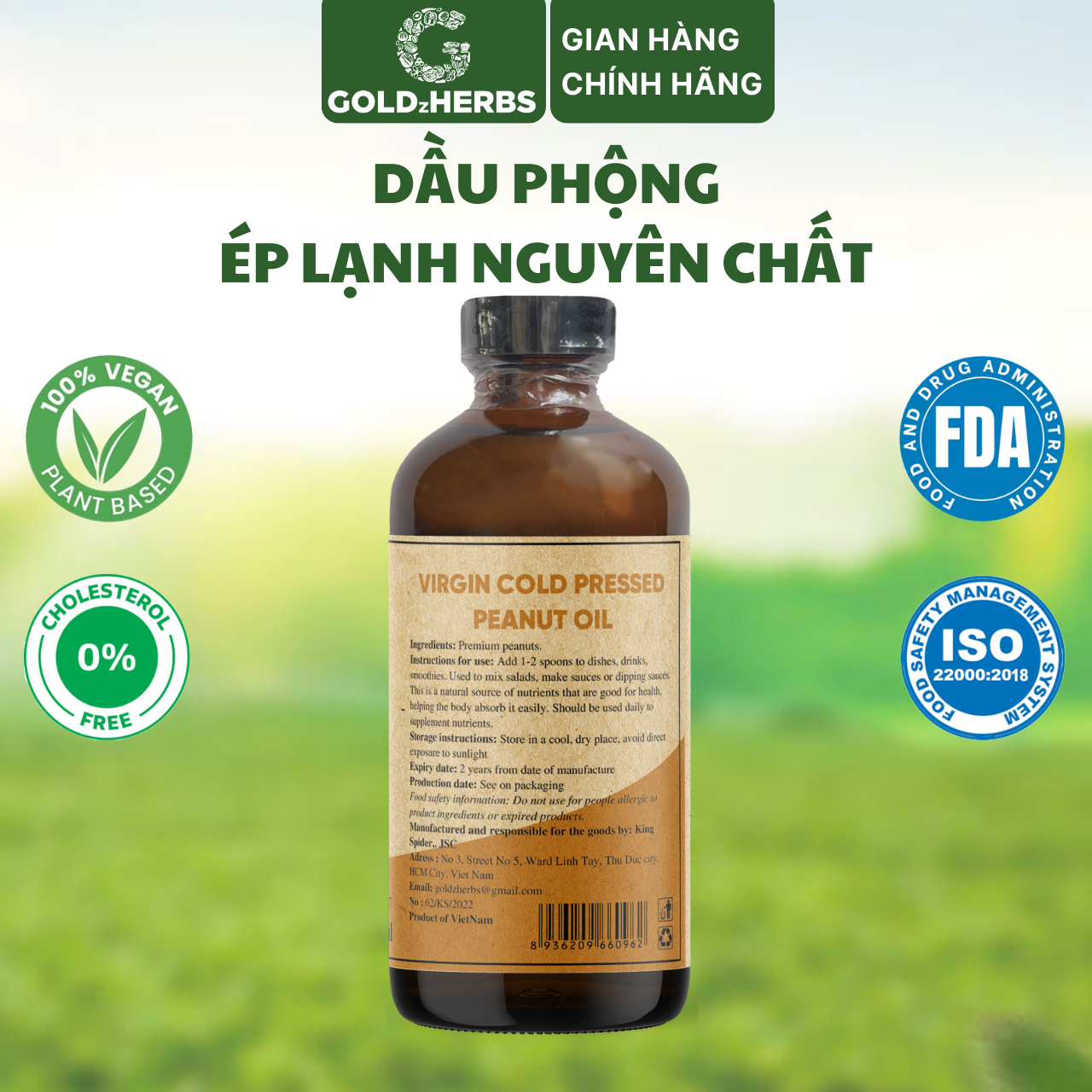 Dầu Phộng Ép Lạnh Nguyên Chất Goldzherbs được làm từ 100% Đậu phộng hữu cơ thuần chủng cao cấp được ép lạnh để giữ trọn hương vị và màu sắc của hạt. HẠN SỬ DỤNG